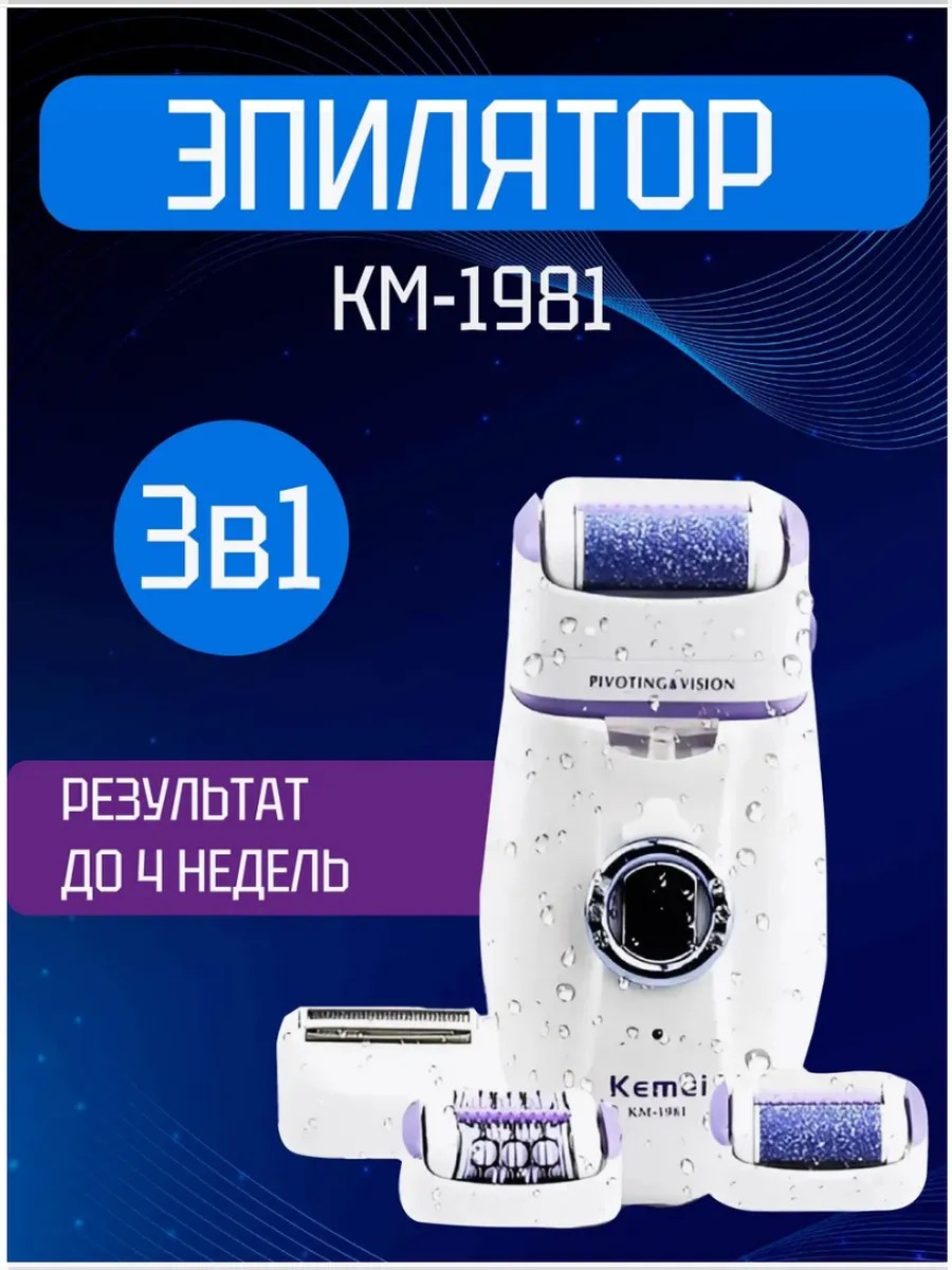 Эпилятор женский KM-1981 3 в 1. Эпилятор имеет 3 насадки: основная для качественной эпиляции, бритвенная с двойным лезвием и насадка-пемза для избавления от мозолей, натоптышей, огрубевшей кожи на ступнях, насадка для филировки. Такой эпилятор для зоны бикини заменяет три отдельных устройства. Бритвенная насадка с двойными лезвиями из стали и защитной сеточкой позволит обработать самые нежные интимные зоны, без раздражения и болезненных ощущений. Насадка пемза мягко и быстро удаляет огрубевшую кожу, делая ступни совершенно гладкими. Вращающаяся роликовая головка действует бережно, не требуется распаривания кожи перед использованием. Просто незаменимый прибор в арсенале любой женщины, желающей всегда выглядеть безупречно. Съемные головки – можно мыть под проточной водой. Скорость: 2. Мощность: 7 Вт. Продолжительность работы: 40 мин. Длина кабеля: 180 см. Размер: 12,5 х 6 х 3 см. Тип двигателя: перезаряжаемый. Материал: ABC-пластик.
