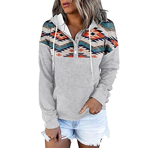 Hoodies for Women Pullover Print Button V Neck Pockets Hooded Jacket Long Sleeve Sweatshirt Graphic Casual with Hood Gray X-Large