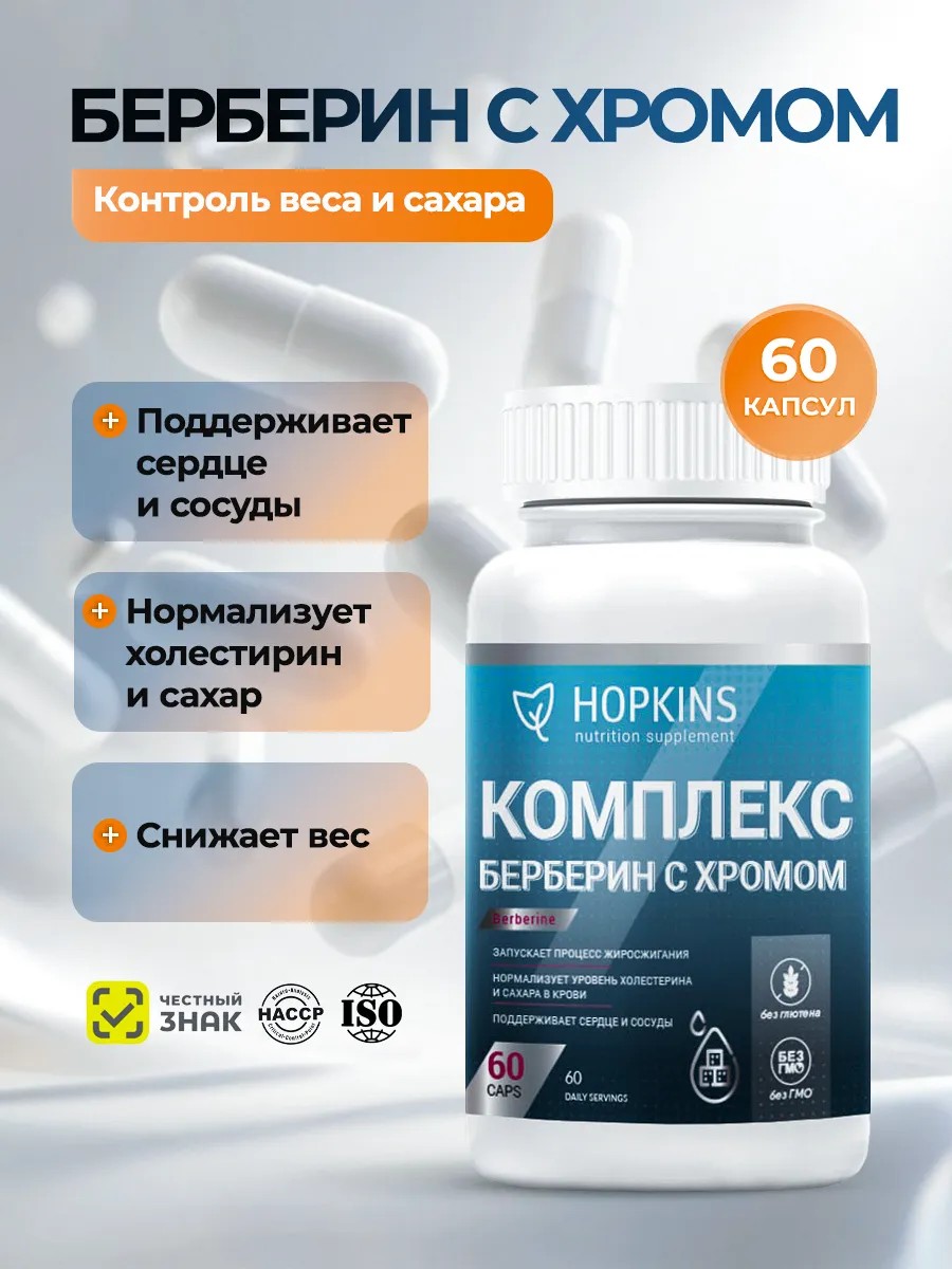 Берберин Hopkins — это средство, известное своими мощными оздоровительными свойствами. Берберин помогает регулировать уровень сахара в крови, поддерживает нормальный уровень холестерина и способствует улучшению обмена веществ. Берберин + хром также обладает антиоксидантными и противовоспалительными свойствами, что помогает защитить клетки от повреждений. Регулярный прием хрома помогает контролировать уровень глюкозы в крови, улучшает чувствительность к инсулину, способствует нормализации уровня холестерина и помогает в управлении весом. Кроме того, он поддерживает здоровье сердечно-сосудистой системы и может способствовать общему укреплению иммунитета. Наши продукты производятся в формате капсул для лучшего усвоения и более легкого проглатывания. Все комплексы прошли проверку на качество и соответствие государственным требованиям по безопасности. Приобретая наши продукты, вы можете быть уверены в их качестве и эффективности. С Hopkins забота о себе и своем здоровье – это просто.