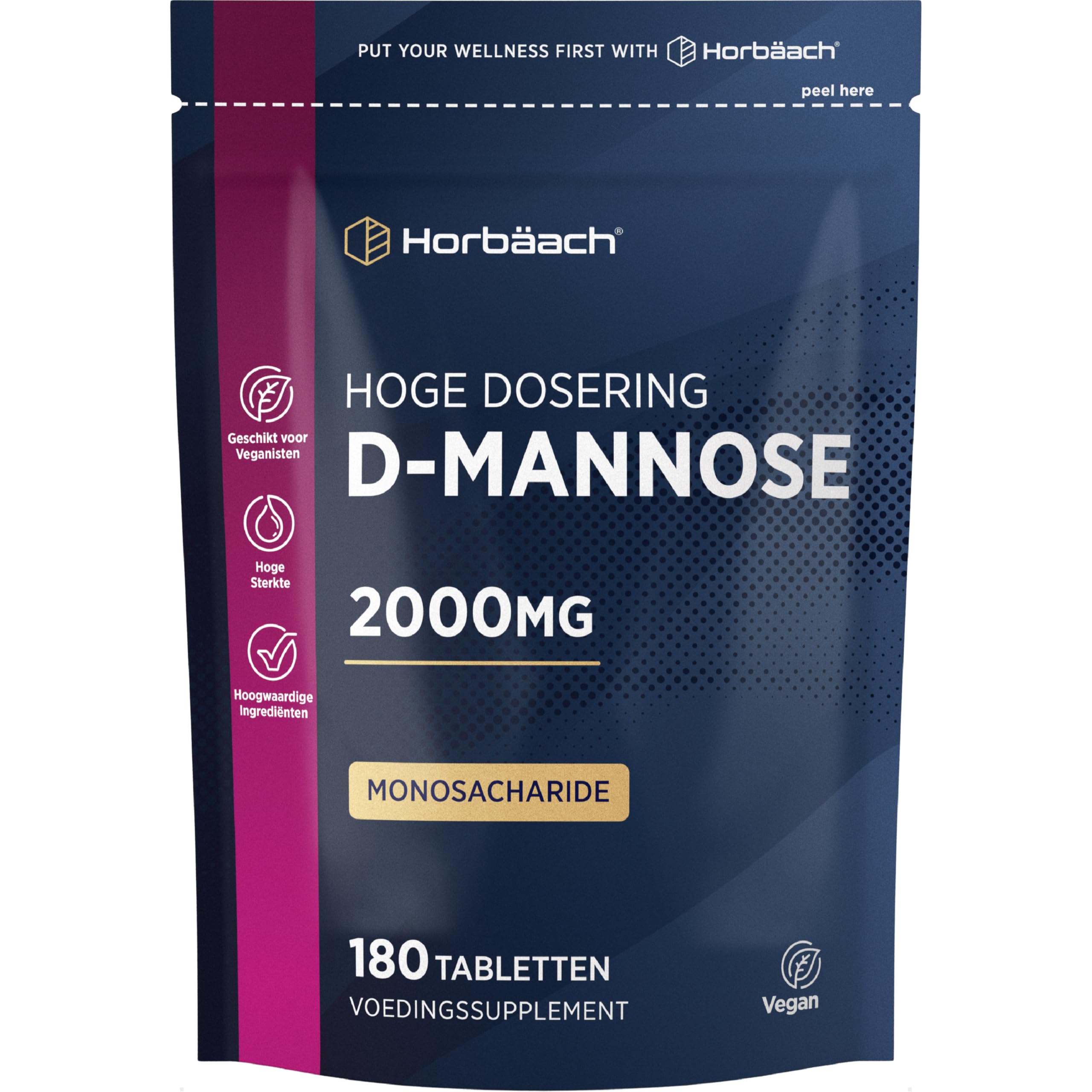 D-mannose, also known as mannose, is a naturally occurring simple sugar related to glucose. It is found in many fruits and vegetables, including cranberries, black and red currants, peaches, green beans, oranges, mangoes, cabbage and tomatoes. It also occurs naturally in the human body However, many people find it helpful to take a dietary supplement to ensure they get enough sugar. These supplements are often available in capsules, tablets, gummies, pills, effervescent, liquid, or powder forms. Horbaach D-Mannose tablets provide you with a 3-month supply and are formulated to deliver a highly effective dose of 2000 mg per daily serving. Enjoy the benefits of D-Mannose to support your wellbeing in easy-to-swallow tablets suitable for both vegans and vegetarians. Although we make every effort to ensure that our product information on our website is up to date, we recommend that you always read labels, warnings, and instructions that accompany the product before using or consuming the product. INGREDIENTS D-mannose, Bulking agent (Microcrystalline cellulose), Anti-caking agents (Magnesium salts of fatty acids, Silicon dioxide). INSTRUCTIONS FOR USE Take 1 tablet per day with a meal. SAFETY WARNING Food supplements should not be used as a substitute for a varied and balanced diet and a healthy lifestyle. If you are pregnant, nursing, taking medication, or have a medical condition, consult your physician or healthcare provider before use. If any side effect occurs, stop using this product immediately and consult your doctor. It is not intended for use by persons under the age of 18. LEGAL DISCLAIMER We make every effort to ensure that the information on this page is accurate at the time of last edit. Because we continually review and develop our products to meet the needs of our consumers, consumers, especially those suffering from allergies and intolerances, should always check the labeling, warnings and instructions on the product supplied before use or consumption. See morePACKAGING MAY VARY: We are in the process of updating our packaging. If the product you receive looks different, you can be assured that the benefits remain the same. Additionally, if your product is labeled in English, you will find a removable label with six additional languages for your convenience. SUITABLE FOR: Horbaach D-Mannose is vegan and vegetarian, free from artificial colours, flavors and preservatives and suitable for men and women. POPULAR: Get all the benefits of cranberry juice without the extra calories. HIGH STRENGTH AND NATURAL SUPPLEMENT: D-Mannose is a type of sugar related to glucose that is found in many fruits and plants. WHY HORBAACH D-MANNOSE TABLETS?: Our formula contains pure D-mannose providing 2000 mg per daily dose.D-Mannose 1000mg Capsules 6 Maanden Voorraat - 180 Vegan Tabletten Alternatief voor Cranberry Puur D-Mannose Horbaach D-mannose, ook bekend als mannose, is een van nature voorkomende eenvoudige suiker die verwant is aan glucose. Het wordt aangetroffen in veel groenten en fruit, waaronder veenbessen, zwarte en rode bessen, perziken, sperziebonen, sinaasappels, mango's, kool en tomaten. Het komt ook van nature voor in het menselijk lichaam Veel mensen vinden het echter nuttig om een voedingssupplement te nemen om ervoor te zorgen dat ze voldoende suiker binnenkrijgen. Deze supplementen zijn vaak verkrijgbaar in capsules, tabletten, gummies, pillen, bruistabletten, vloeibare of poedervorm. Horbaach D-Mannose-tabletten bieden u een voorraad voor 3 maanden en zijn geformuleerd om een zeer effectieve dosis van 2000 mg per dagelijkse portie te leveren. Geniet van de voordelen van D-Mannose om uw welzijn te ondersteunen in gemakkelijk in te slikken tabletten die geschikt zijn voor zowel veganisten als vegetariërs. Hoewel we er alles aan doen om ervoor te zorgen dat onze productinformatie op onze website actueel is, raden wij u aan altijd de etiketten, waarschuwingen en instructies bij het product te lezen voordat u het product gebruikt of consumeert. INGREDIËNTEN D-mannose, Vulstof (Microkristallijne cellulose), Antiklontermiddelen (Magnesiumzouten van vetzuren, Siliciumdioxide). GEBRUIKSAANWIJZING Neem 1 tablet per dag bij een maaltijd. VEILIGHEIDSWAARSCHUWING Voedingssupplementen mogen niet worden gebruikt als vervanging voor een gevarieerde en evenwichtige voeding en een gezonde levensstijl. Als u zwanger bent, borstvoeding geeft, medicijnen gebruikt of een medische aandoening heeft, raadpleeg dan vóór gebruik uw arts of zorgverlener. Als er een bijwerking optreedt, stop dan onmiddellijk met het gebruik van dit product en raadpleeg uw arts. Het is niet bedoeld voor gebruik door personen jonger dan 18 jaar. WETTELIJKE DISCLAIMER Wij doen ons uiterste best om ervoor te zorgen dat de informatie op deze pagina accuraat is op het moment van de laatste bewerking. Omdat we onze producten voortdurend herzien en ontwikkelen om aan de behoeften van onze consumenten te voldoen, moeten consumenten, vooral degenen die lijden aan allergieën en intoleranties, altijd de etikettering, waarschuwingen en instructies op het geleverde product controleren vóór gebruik of consumptie. Meer bekijkenVERPAKKING KAN VARIËREN: We zijn bezig onze verpakking te vernieuwen. Als het product dat u ontvangt er anders uitziet, kunt u er zeker van zijn dat de voordelen hetzelfde blijven. Bovendien vindt u, als uw product in het Engels is geëtiketteerd, voor uw gemak een afneembaar etiket met zes extra talen. GESCHIKT VOOR: Horbaach D-Mannose is vegan en vegetarisch, vrij van kunstmatige kleur-, smaak- en bewaarmiddelen en geschikt voor mannen en vrouwen. POPULAIRE: Profiteer van alle voordelen van cranberrysap zonder de extra calorieën. HOGE STERKTE EN NATUURLIJKE AANVULLING: D-Mannose is een soort suiker die verwant is aan glucose en die in veel fruit en planten voorkomt. WAAROM HORBAACH D-MANNOSE TABLETTEN?: Onze formule bevat pure D-mannose die 2000 mg per dagelijkse dosis levert.
