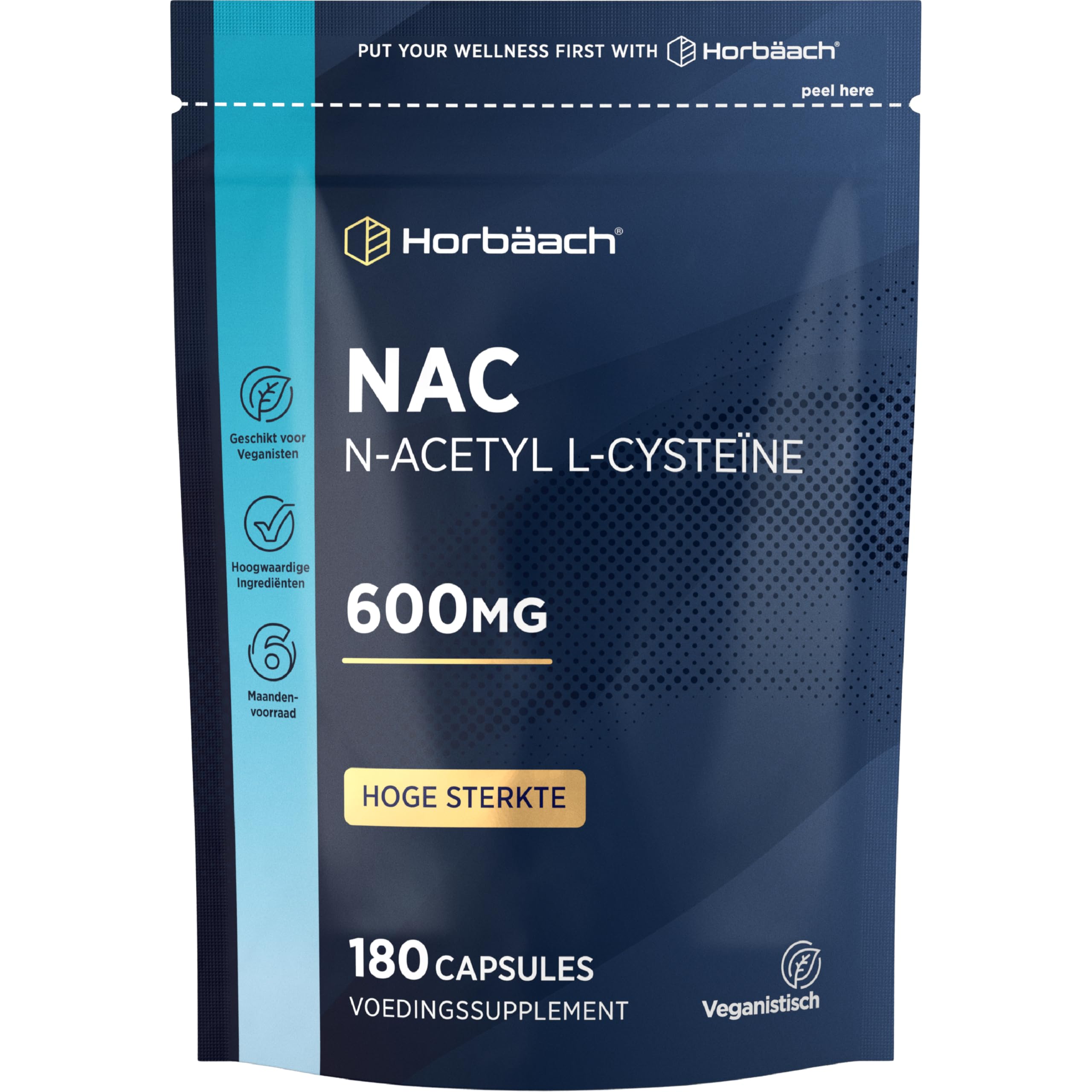 What is N-Acetyl Cysteine? N-Acetyl-Cysteine is one of 20 amino acids that serve as building blocks of proteins throughout the body. Proteins form the structure of all body cells and tissues, including muscle tissue, internal organs, tendons, hair, skin and nails. Cysteine is a non-essential amino acid because it is one of the 12 amino acids that the body can produce itself. Commonly found in protein-rich foods such as chicken, eggs and legumes, cysteine is also a popular dietary supplement that is now available in many different forms – for example as tablets, powder, drops, gummies, capsules or sprays. What are the benefits of NAC nutritional supplements? Together with two other amino acids – glutamine and glycine – NAC is needed to form and replenish glutathione. Glutathione is a compound that helps neutralize free radicals, which can damage cells and tissues in the body. NAC is not only suitable for humans, but is also used in animals such as cats and dogs to support overall health. INGREDIENTS N-Acetyl-L-Cysteine, capsule (shell: hydroxypropyl methylcellulose), fillers (microcrystalline cellulose, calcium phosphates), anti-caking agents (magnesium salts of fatty acids, silicon dioxide). INSTRUCTIONS FOR USE Take 1 capsule daily with a meal. SAFETY WARNING Food supplements should not be used as a substitute for a varied and balanced diet and a healthy lifestyle. If you are pregnant, nursing, taking medication, or have a medical condition, consult your physician or healthcare provider before use. If any side effect occurs, stop using this product immediately and consult your doctor. It is not intended for use by persons under the age of 18. See morePACKAGING MAY VARY: We are currently updating our packaging design. If the delivered product looks different, you can be assured that the benefits remain unchanged. SUITABLE FOR: Horbaach N-Acetyl-Cysteine capsules are suitable for vegans and vegetarians and offer the perfect formula for adult men and women – with the best value for money. PROFESSIONALLY FORMULATED: Our high-quality formula stands for purity and effectiveness. BENEFITS: N-Acetyl-Cysteine is an amino acid needed to form and replenish glutathione – a compound that helps neutralize free radicals that can damage cells and tissues in the body. HIGH DOSE: The Horbaach NAC dietary supplement provides 600 mg N-Acetyl-L-Cysteine per daily dose.N-Acetyl Cysteine 600 mg 180 Veganska Kapslar Hög Styrka 6 Maanden Voorraad N-Acetylcysteïne Supplement van Horbaach Wat is N-Acetyl-Cysteïne? N-Acetyl-Cysteïne is een van de 20 aminozuren die dienen als bouwstenen van eiwitten in het hele lichaam. Eiwitten vormen de structuur van alle lichaamscellen en weefsels, waaronder spierweefsel, inwendige organen, pezen, haar, huid en nagels. Cysteïne is een niet-essentieel aminozuur omdat het behoort tot de 12 aminozuren die het lichaam zelf kan aanmaken. Cysteïne komt vaak voor in eiwitrijke voedingsmiddelen zoals kip, eieren en peulvruchten en is ook een populair voedingssupplement dat tegenwoordig in veel verschillende vormen verkrijgbaar is – bijvoorbeeld als tabletten, poeder, druppels, gummies, capsules of sprays. Wat zijn de voordelen van NAC-voedingssupplementen? Samen met twee andere aminozuren – glutamine en glycine – is NAC nodig om glutathion te vormen en aan te vullen. Glutathion is een verbinding die helpt vrije radicalen te neutraliseren, die cellen en weefsels in het lichaam kunnen beschadigen. NAC is niet alleen geschikt voor mensen, maar wordt ook gebruikt bij dieren zoals katten en honden ter ondersteuning van de algehele gezondheid. INGREDIËNTEN N-Acetyl-L-Cysteïne, capsule (omhulsel: hydroxypropylmethylcellulose), vulstoffen (microkristallijne cellulose, calciumfosfaten), antiklontermiddelen (magnesiumzouten van vetzuren, siliciumdioxide). GEBRUIKSAANWIJZING Dagelijks 1 capsule innemen bij een maaltijd. VEILIGHEIDSWAARSCHUWING Voedingssupplementen mogen niet worden gebruikt als vervanging voor een gevarieerde en evenwichtige voeding en een gezonde levensstijl. Als u zwanger bent, borstvoeding geeft, medicijnen gebruikt of een medische aandoening heeft, raadpleeg dan vóór gebruik uw arts of zorgverlener. Als er een bijwerking optreedt, stop dan onmiddellijk met het gebruik van dit product en raadpleeg uw arts. Het is niet bedoeld voor gebruik door personen jonger dan 18 jaar. Meer bekijkenVERPAKKING KAN VARIËREN: We werken momenteel ons verpakkingsontwerp bij. Als het geleverde product er anders uitziet, kunt u er zeker van zijn dat de voordelen ongewijzigd blijven. GESCHIKT VOOR: Horbaach N-Acetyl-Cysteïne-capsules zijn geschikt voor veganisten en vegetariërs en bieden de perfecte formule voor volwassen mannen en vrouwen – met de beste prijs-kwaliteitverhouding. PROFESSIONEEL SAMENGESTELD: Onze hoogwaardige formule staat voor zuiverheid en doeltreffendheid. VOORDELEN: N-Acetyl-Cysteïne is een aminozuur dat nodig is om glutathion te vormen en aan te vullen – een verbinding die helpt vrije radicalen te neutraliseren die cellen en weefsels in het lichaam kunnen beschadigen. HOOGGEDOSEERD: Het Horbaach NAC-voedingssupplement levert 600 mg N-Acetyl-L-Cysteïne per dagdosering.