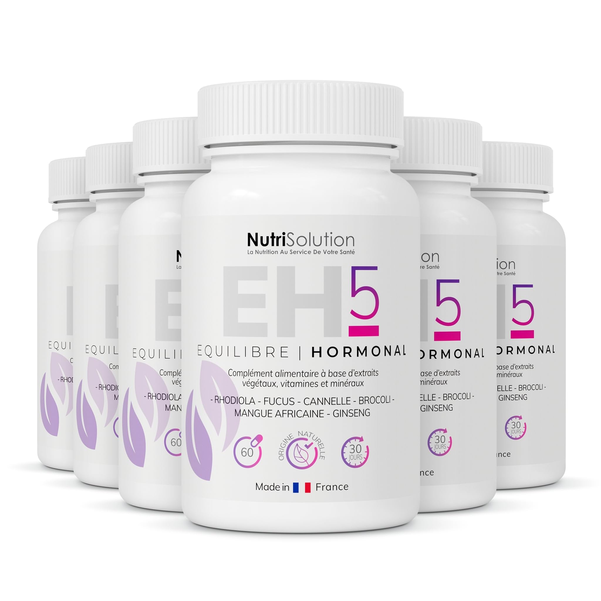 NutriSolution INGREDIENTS Ingredients per 2 capsules: Ginseng: 600 mg Cinnamon: 500 mg African Mango: 500 mg Rhodiola: 150 mg Fucus: 87.3 mg (including 44 µg of iodine) Laminaria (Kelp): 80 mg (including 80 µg of iodine) Magnesium: 100 mg (26 NRV) Broccoli (including Glucoraphanin): 72.7 mg (4 mg of glucosinolate) Zinc: 10 mg (100 NRV) Manganese: 2 mg (100 NRV) Copper: 1 mg (100 NRV) Selenium: 150 µg (272 NRV) Vitamin B12: 2.5 µg (100 NRV) Notes: NRV : Nutrient Reference Values The product is free from artificial preservatives, gluten, lactose and GMOs.PROMOTES OVERALL WELL-BEING: The combination of Ginseng and Magnesium meets daily energy needs and helps reduce fatigue, while Cinnamon and Broccoli promote digestion and support the body's detoxification. This synergistic effect helps optimize metabolism and improve overall health. Please note that this supplement is not a substitute for a healthy lifestyle and results may vary from person to person. NATURAL AND NUTRIENT-DRIED: Contains Laminaria, Bladderwrack, Rhodiola, Ginseng, African Mango, Broccoli, Cinnamon, Magnesium, Zinc, Selenium, and Vitamin B12. This product is free from artificial preservatives, gluten, lactose, and GMOs, offering a natural supplement choice. EASY AND EFFECTIVE USE: Take 2 capsules daily with half a glass of water, preferably with a meal. Each bottle contains 60 capsules, providing a 30-day supply. Follow the recommended dosage for best results. PREMIUM QUALITY STANDARDS FROM FRANCE: NutriSolution guarantees the highest quality standards. As a trusted French brand, all dietary supplements are manufactured in France according to strict GMP standards. Each batch undergoes rigorous testing to ensure purity, efficacy, and consistency. SUPPORTS THE ENDOCRINE SYSTEM: EH-5 contains a blend of Rhodiola, Fucus, and Ginseng, which help maintain a healthy hormonal balance. These ingredients contribute to hormone regulation and promote overall well-being. NutriSolution INGRÉDIENTS Ingrédients pour 2 capsules : Ginseng : 600 mg Cannelle : 500 mg Mangue d'Afrique : 500 mg Rhodiola : 150 mg Fucus : 87,3 mg (dont 44 µg d'iode) Laminaire (Kelp) : 80 mg (dont 80 µg d'iode) Magnésium : 100 mg (26 VNR) Brocoli (dont Glucoraphanine) : 72,7 mg (4 mg de glucosinolate) Zinc : 10 mg (100 VNR) Manganèse : 2 mg (100 VNR) Cuivre : 1 mg (100 VNR) Sélénium : 150 µg (272 VNR) Vitamine B12 : 2,5 µg (100 VNR) Remarques : VNR : Valeurs Nutritionnelles de Référence Le produit est exempt de conservateurs artificiels, de gluten, de lactose et d'OGM.FAVORISE LE BIEN-ÊTRE GÉNÉRAL : La combinaison de Ginseng et de Magnésium répond aux besoins énergétiques quotidiens et aide à réduire la fatigue, tandis que la Cannelle et le Brocoli favorisent la digestion et soutiennent la détoxification du corps. Cet effet synergique aide à optimiser le métabolisme et à améliorer la santé globale. Veuillez noter que ce supplément ne remplace pas un mode de vie sain et que les résultats peuvent varier d'une personne à l'autre. NATUREL ET RICHE EN NUTRIMENTS : Contient Laminaria, Fucus, Rhodiola, Ginseng, Mangue Africaine, Brocoli, Cannelle, Magnésium, Zinc, Sélénium et Vitamine B12. Ce produit est sans conservateurs artificiels, sans gluten, sans lactose et sans OGM, offrant un choix de complément naturel. UTILISATION FACILE ET EFFICACE : Prenez 2 capsules par jour avec un demi-verre d'eau, de préférence pendant un repas. Chaque flacon contient 60 capsules, fournissant un approvisionnement de 30 jours. Suivez la posologie recommandée pour de meilleurs résultats. NORMES DE QUALITÉ SUPÉRIEURE DE FRANCE : NutriSolution garantit les normes de qualité les plus élevées. En tant que marque française de confiance, tous les compléments alimentaires sont fabriqués en France selon des normes GMP strictes. Chaque lot est soumis à des tests rigoureux pour assurer pureté, efficacité et cohérence. SOUTIENT LE SYSTÈME ENDOCRINIEN : EH-5 contient un mélange de Rhodiola, Fucus et Ginseng, qui aident à maintenir un équilibre hormonal sain. Ces ingrédients contribuent à la régulation des hormones et favorisent le bien-être général.