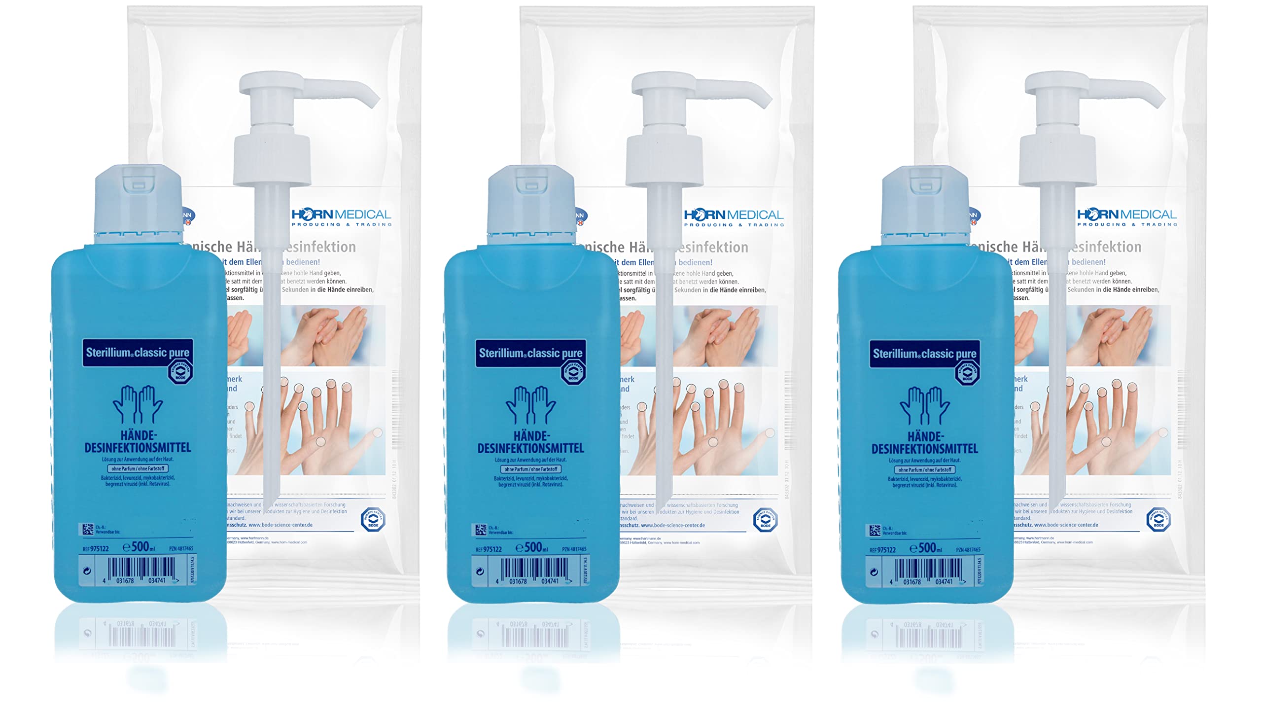 Horn Medical dosing pumps are compatible with sterillium pure - included in the delivery - which is particularly skin -friendly due to its dye and perfume -free composition, even with sensitive skin. For all hygiene-relevant areas in healthcare and industry, in domestic health, elderly and infant care, in home dialysis.Protects against infection in public institutions and when traveling. Contraindications: Not suitable for disinfection of mucous membranes.Do not use in the immediate vicinity of the eyes or open wounds.Hypersensitivity (allergy) against one of the ingredients. Side effects: Occasionally, slight drought or irritation of the skin can occur.In such cases, it is recommended to intensify general skin care.Allergic reactions are rare. Warnings: The supplied hand disinfectant should not be used for new and premature babies.The application in infants and toddlers should only take place after medical consultation.Use electrical devices only after drying up.Do not bring in contact with open flames.Also do not use near ignition sources.Flaming point 23 ° C, inflammatory.If the preparation is used intended, fire and explosion risks are not to be expected.After spilling the disinfectant, the following measures must be taken: immediate absorption of the liquid, dilute with lots of water, ventilation of the room and the elimination of ignition sources.Do not smoke.In the event of a fire with water, extinguishing powder, foam or CO 2.Any transferring may only take place under aseptic conditions (steril bench), otherwise the product will lose its effectiveness. Warnings Read the package supplement and ask your doctor or pharmacist for risks and side effects. LEGAL NOTICE Read the package supplement and ask your doctor or pharmacist for risks and side effects. More thanks to the included practical horn dosing pump (s) directly ready for use and ready for use.Applicable everywhere: at home, at work, when traveling, in public institutions….Look reliably and immediately up to 6 hours against yeast, bacteria and viruses.For hygienic and surgical hand disinfection for rubbing - regardless of sink and water.Horn dosing pumps are compatible with sterillium pure hand disinfectant - contained in the delivery - which is particularly skin -friendly due to its dye and perfume -free composition, even with sensitive skin. Horn Medical Dosierpumpen sind kompatibel mit Sterillium Pure - IN DER LIEFERUNG ENTHALTEN - welches aufgrund seiner farbstoff- und parfümfreien Zusammensetzung besonders hautverträglich ist, auch bei empfindlicher Haut. Für alle hygienerelevanten Bereiche in Gesundheitswesen und Industrie, in der häuslichen Kranken-, Alten- und Säuglingspflege, bei der Heimdialyse. Schützt vor Ansteckungen in öffentlichen Einrichtungen und auf Reisen. Gegenanzeigen: Für die Desinfektion von Schleimhäuten nicht geeignet. Nicht in unmittelbarer Nähe der Augen oder offener Wunden anwenden. Überempfindlichkeit (Allergie) gegen einen der Inhaltsstoffe. Nebenwirkungen: Gelegentlich kann eine leichte Trockenheit oder Reizung der Haut auftreten. In solchen Fällen wird empfohlen, die allgemeine Hautpflege zu intensivieren. Allergische Reaktionen sind selten. Warnhinweise: Das mitgelieferte Händedesinfektionsmittel soll nicht bei Neu - und Frühgeborenen angewendet werden. Die Anwendung bei Säuglingen und Kleinkindern soll erst nach Ärztlicher Rücksprache erfolgen. Erst nach Auftrocknung elektrische Geräte benutzen. Nicht in Kontakt mit offenen Flammen bringen. Auch nicht in der Nähe von Zündquellen verwenden. Flammpunkt 23 °C, entzündlich. Bei bestimmungsgemäßer Verwendung des Präparates ist mit Brand und Explosionsgefahren nicht zu rechnen. Nach Verschütten des Desinfektionsmittels sind folgende Maßnahmen zu treffen: sofortiges Aufnehmen der Flüssigkeit, Verdünnen mit viel Wasser, Lüften des Raumes sowie das Beseitigen von Zündquellen. Nicht rauchen. Im Brandfall mit Wasser, Löschpulver, Schaum oder CO 2 löschen. Ein etwaiges Umfüllen darf nur unter aseptischen Bedingungen (Sterilbank) erfolgen, da sonst das Produkt seine Wirksamkeit verliert. WARNHINWEISE Zu Risiken und Nebenwirkungen lesen Sie die Packungsbeilage und fragen Sie Ihren Arzt oder Apotheker. RECHTLICHE HINWEISE Zu Risiken und Nebenwirkungen lesen Sie die Packungsbeilage und fragen Sie Ihren Arzt oder Apotheker. MehrDank mitgelieferter praktischer Horn-Dosierpumpe(n) direkt gebrauchsfertig und einsatzbereit. Überall einsatzfähig: Zuhause, am Arbeitsplatz, auf Reisen, in Öffentlichen Einrichtungen…. Wirkt zuverlässig und sofort bis zu 6 Stunden gegen Hefepilze, Bakterien und behüllte Viren. Zur hygienischen und chirurgischen Händedesinfektion zum Einreiben - unabhängig von Waschbecken und Wasser. Horn Dosierpumpen sind kompatibel mit Sterillium PURE Händedesinfektionsmittel - IN DER LIEFERUNG ENTHALTEN - welches aufgrund seiner farbstoff- und parfümfreien Zusammensetzung besonders hautverträglich ist, auch bei empfindlicher Haut.Horn Medical Dosierpumpen (3 Stück) mit Sterillium PURE Haut-sensitive Händedesinfektionsmittel (3 x 500ml)