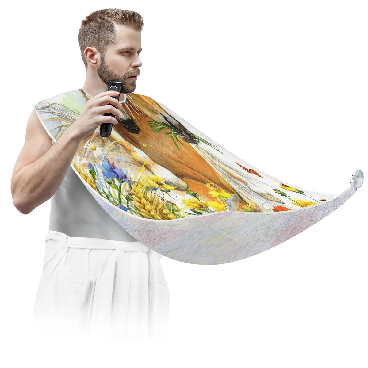 fiber fabric, ensuring exceptional quality. The fabric has a smooth and soft surface that is not sticky to hair, making it comfortable to wear during grooming sessions. It is also waterproof and anti-static, further enhancing its practicality. In addition, it is equipped with two high-quality suction hooks that provide powerful suction without leaving marks on mirrors or tiles. ?Convenient and Easy to Use?: Using our beard hair catcher is a breeze. Just fasten it around your neck using the adjustable strap and secure it to the mirror. Once in place, you can effortlessly proceed with your regular grooming routine. When you're done, simply remove the beard bib from the suction cups. Then brush the collected hair into the trash can for easy cleanup. ?Effortless Hair Cleanup?: Our Horse Butterfly Flower beard bib is expertly designed to capture all loose beard hair, mustache, and sideburn trimmings, providing effortless cleanup and keeping your sink immaculately clean. This saves you valuable time that would otherwise be spent on tedious cleaning tasks. Not only does it serve a practical function, but it also adds a stylish touch to your daily grooming routine.