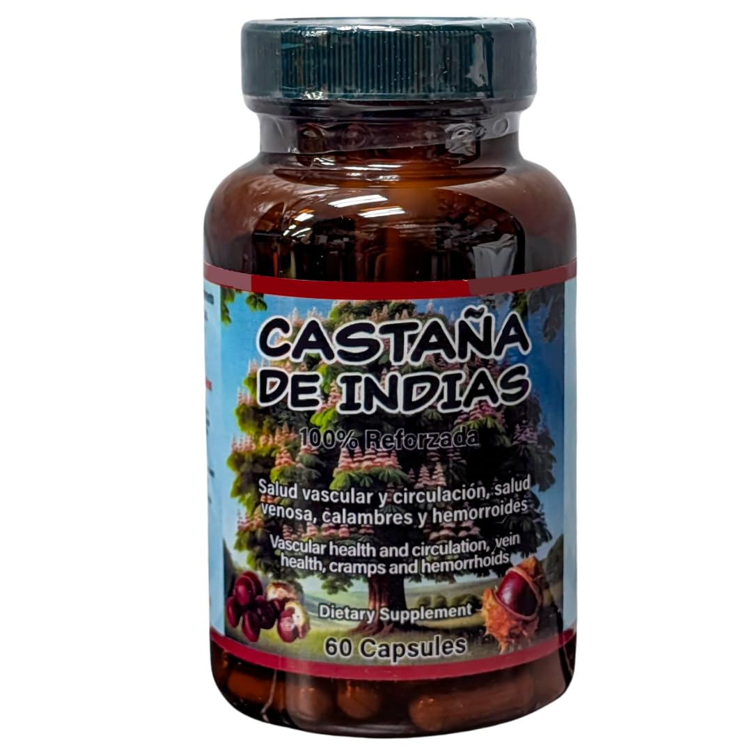 Castaña de Indias es un suplemento natural formulado para apoyar la salud vascular y mejorar la circulación sanguínea. Su fórmula reforzada contiene una combinación de ingredientes botánicos como Hamamelis, Ginkgo Biloba, Ajo, Palo de Brasil y Brezo Mexicano, los cuales trabajan en sinergia para promover el flujo sanguíneo saludable, reducir calambres y apoyar la salud de las venas. Horse Chestnut is a natural supplement formulated to support vascular health and improve blood circulation. This reinforced formula contains a blend of botanical ingredients such as Witch Hazel, Ginkgo Biloba, Garlic, Palo de Brasil, and Mexican Heather, which work synergistically to promote healthy blood flow, reduce cramps, and support vein health. Each bottle contains 60 vegetable capsules, providing a one-month supply when taken as directed. Ideal for those looking to improve circulation, relieve leg discomfort, and strengthen vascular health. Ingredients: - Horse Chestnut (Aesculus hippocastanum L.) - Witch Hazel Leaves (Hamamelis Virginiana) - Garlic Bulb (Allium sativum) - Ginkgo Biloba Leaves (Ginkgo Biloba) - Palo de Brasil Bark (Tabebuia impetiginosa) - Mexican Heather Bark (Calluna vulgaris) - Vegetable Cellulose (Veggie Capsule) Contains traces of Vitamin A, Vitamin C, Calcium, and Iron.Fácil de consumir – Solo 2 cápsulas diarias, media hora antes de las comidas, para obtener mejores resultados. (Easy to take – Just 2 capsules daily, half an hour before meals, for best results. ). Cápsulas aptas para vegetarianos – Elaboradas con celulosa vegetal para una mejor digestión. (Vegetarian-friendly capsules – Made with vegetable cellulose for easy digestion. ). Fortalece venas y capilares – Apoya la resistencia de los vasos sanguíneos, ideal para quienes pasan largos periodos sentados o de pie. (- Strengthens veins and capillaries – Supports vascular resilience, ideal for those who spend long periods sitting or standing. ). Ayuda a reducir calambres y malestar – Puede contribuir al alivio de molestias ocasionales en las piernas. ( Helps reduce cramps and discomfort – May support relief from occasional leg discomfort. ). Ingredientes 100 naturales – Contiene extractos botánicos como Castaña de Indias, Hamamelis y Ginkgo Biloba. (100 natural ingredients – Contains botanical extracts such as Horse Chestnut, Witch Hazel, and Ginkgo Biloba. ). Apoya la salud vascular y la circulación – Fórmula diseñada para promover un flujo sanguíneo saludable y el bienestar de las venas. (Supports vascular health and circulation – Formulated to promote healthy blood flow and vein function. ).