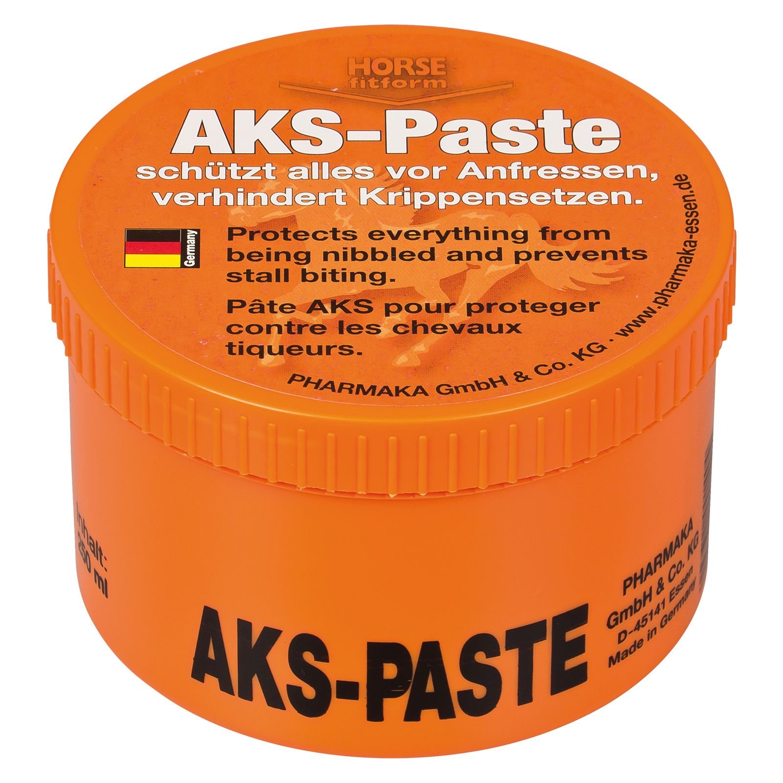 "Protects the horse from injuries due to swallowing or biting parts. AKS protects immediately and reliably. AKS consists of natural defenses (pepper extract) and is completely harmless when used correctly. Do not use on humans or animals. Application: Do not apply AKS paste too thinly to the areas to be protected: ceilings, bandages, tie-up strips, box walls, gates, angled fences and crib borders. Simply rub the parts that the horse will bite on with the paste. Ingredients: rapeseed oil, virgin wax base (wheat, sunflower), capsicum (chili pepper extract), contains 0.3 capsaicin per liter. The packaging of these products is made of sustainable polyethylene (e.g. from sugar, corn, etc.) and not made from petroleum. SET CONTENTS 1 pieceDo not use on humans or animals. Do not apply AKS Paste too thinly to the areas to be protected. AKS consists of natural defenses (pepper extract) and is completely harmless when used correctly. AKS can be applied to all common objects (knitwear, blankets, girths, etc.) or surfaces (beams, gates, mangers, etc.) around the horse that are resistant to natural oils and oleoresin (natural wood, hard plastic such as PE, PP, PET, metals, etc.). AKS Paste protects your horse from absorbing foreign bodies such as shavings, fibers, or other foreign bodies through ingestion or biting, and thus prevents serious injuries or illnesses (e.g., colic, etc.). To combat mountainous slough, use AKS Paste. « Protège le cheval contre les blessures en cas d'ingestion ou de mordre des pièces. AKS protège immédiatement et de manière fiable. AKS se compose de défenses naturelles (extrait de poivre) et est totalement inoffensif lorsqu'il est utilisé correctement. Ne pas utiliser sur les humains ou les animaux. Application : ne pas appliquer la pâte AKS trop fine sur les zones à protéger : plafonds, bandages, bandes d'attachement, murs de boîtes, portes, clôtures coudées et bordures de crèche. Frottez simplement les parties sur lesquelles le cheval mordra avec la pâte. Ingrédients : huile de colza, base de cire vierge (blé, tournesol), capsicum (extrait de piment), contient 0,3 de capsaïcine par litre. L'emballage de ces produits est en polyéthylène durable (par exemple à partir de sucre, de maïs, etc.) et non fabriqué à partir de pétrole. CONTENU DU COFFRET 1 pièceNe pas utiliser sur les humains ou les animaux. Ne pas appliquer la pâte AKS trop fine sur les zones à protéger. AKS se compose de défenses naturelles (extrait de poivre) et est totalement inoffensif lorsqu'il est utilisé correctement. AKS peut être appliqué sur tous les objets courants (tricots, couvertures, sangles, etc.) ou surfaces (poutres, portes, crèches, etc.) autour du cheval qui sont résistants aux huiles naturelles et à l'oléorésie (bois naturel, plastique dur tels que PE, PP, PET, métaux, etc.). La pâte AKS protège votre cheval contre l'absorption de corps étrangers tels que des copeaux, des fibres ou d'autres corps étrangers par ingestion ou mordre, et évite ainsi de graves blessures ou maladies (par exemple les coliques, etc.). Pour lutter contre les montagnes, prenez de la pâte AKS.