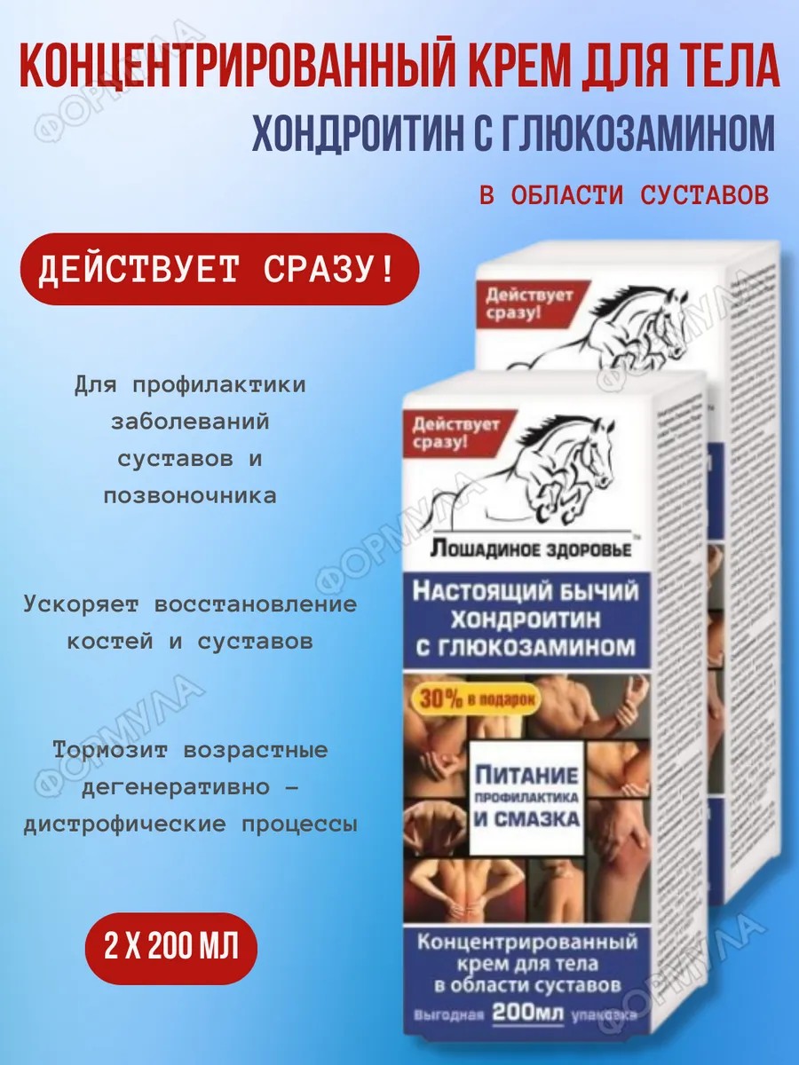 | Комплектация | ЛОШАДИНОЕ ЗДОРОВЬЕ КРЕМ Д/ТЕЛА КОНЦ ХОНДРОИТИН ГЛЮКОЗАМИН ПИТАНИЕ И СМАЗКА 200МЛ*2шт |