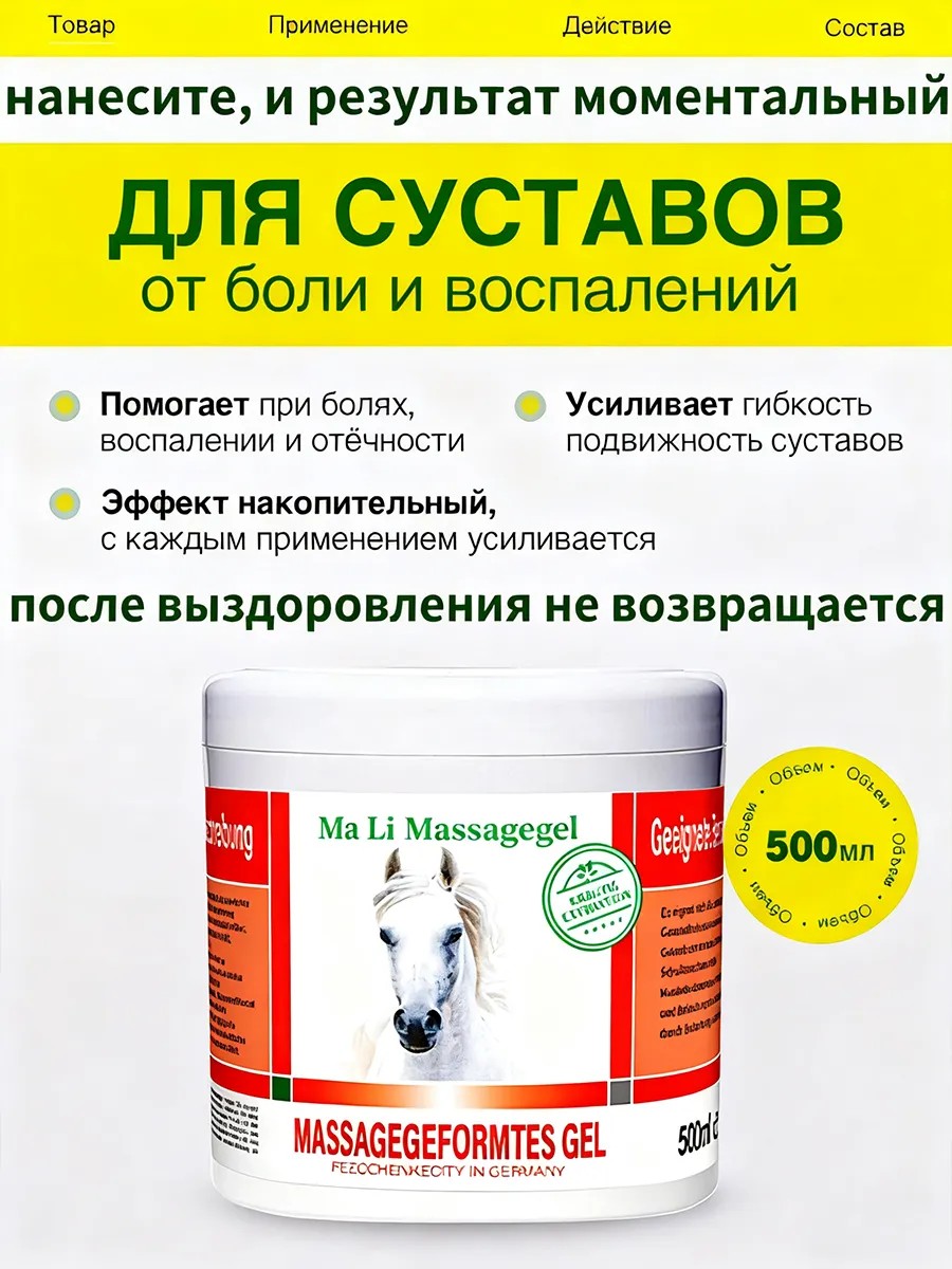 German Horse Cream is a natural product created specifically for body care, helping to manage pain and promote recovery after physical activity. It is the number one pharmacy ointment for the treatment and prevention of a wide range of musculoskeletal conditions, including joint pain, warming and relaxing muscles and nerve tension. The gel is recommended for supportive treatment of arthrosis, arthritis, osteoporosis, and sports injuries. The therapeutic formula is suitable for women and men of all ages, from athletes to the elderly. With regular use, the product maintains joint health and eliminates discomfort and swelling in the back, knees, elbows, hands, ankles, and the lumbar and cervical spine. The combination of oils relieves localized discomfort, has a relaxing effect, and promotes a feeling of comfort. This ointment has a pronounced analgesic and cooling effect thanks to natural menthol and peppermint oil and is recommended for preventing muscle strain and leg fatigue after physical activity. Vitamin E slows the aging process of skin cells, prevents blood clots and promotes their resorption, promotes skin healing, and reduces the risk of scar tissue formation. It also has a general tonic effect. The consistency of Horse Force Balm allows it to be used for therapeutic massage, rubbing, and compresses. The product is suitable not only for relieving pain after sports injuries or muscle strains, but also for gentle skin care. Its special formula is designed to cool muscles after intense exercise. Use the product as a daily balm to protect joints from excessive strain. The large jar ensures long-lasting use, even with active use. The plastic packaging is convenient for storage at home or transporting in a gym bag.