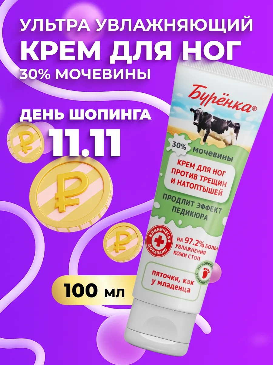| Полное наименование товара | Крем для ног и пяточек против трещин и натоптышей увлажняющий с мочевиной 30% Буренка 100мл |