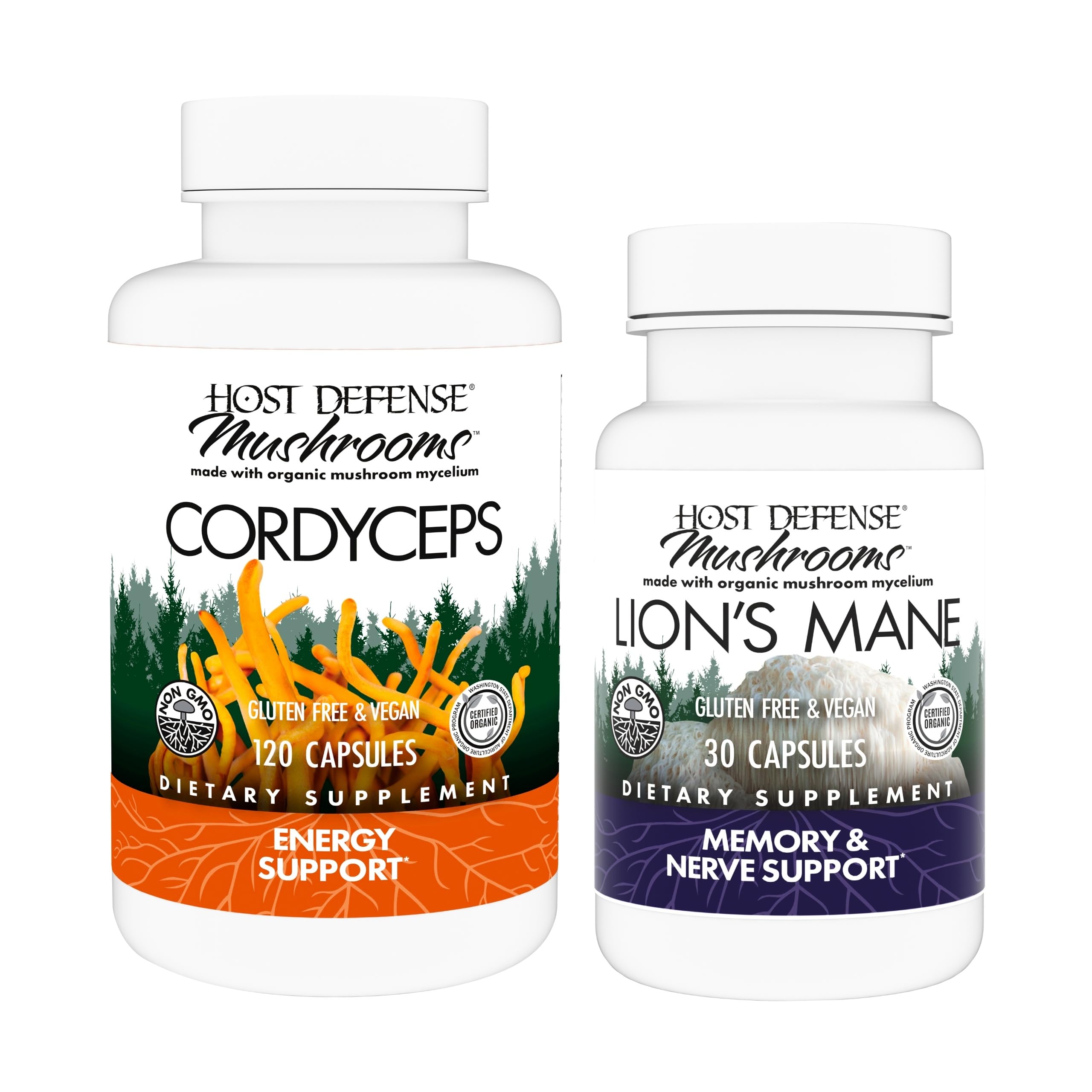 Explore the numerous health benefits of mushrooms with this Host Defense bundle that includes Cordyceps Capsules and Lion's Mane Capsules. Cordyceps Capsules Each Cordyceps mushroom supplement supports energy and stamina, as well as kidney health, lung health for fitness performance, and brain health with aging. Cordyceps is a beneficial mushroom that has traditionally been used to support immune health and overall health during high-altitude activities. This mushroom supplement is great for supporting the health of athletes or casual gym goers.* Lion's Mane Capsules Each capsule supports focus, memory, and cognition. Our Lion's Mane supplement supports brain health and function, nervous system function, and immune system health. Lion's Mane offers support for clarity and a positive attitude. Whether you're a professional looking to sharpen your focus, a student aiming to support your study sessions, or simply seeking to aid your memory, Lion's Mane is a thoughtful addition to your daily regimen.* Powered by organic mushroom mycelium, Host Defense products don't contain any fillers and are third-party tested for quality and safety.* Fungi Perfecti, makers of Host Defense Mushrooms, is a family owned company founded in 1980 by renowned mycologist Paul Stamets with the goal of building the connection between health and beneficial fungi. Our certified organic mushroom mycelium and fruit bodies are grown at our farm near the Olympic Rainforest in Washington State and are sustainably cultivated from responsibly cultured wild strains.* Our mycelium-based mushroom products are non-GMO, gluten-free, and vegan. We are a certified B Corporation and we use eco-conscious packaging that aligns without 110% Climate Positive Commitment. Our continued mission is to explore, study, preserve, and spread knowledge about the use of fungi to help bees, trees, people, and the planet.*"About Host Defense: Host Defense Mushrooms was founded by renowned mycologist Paul Stamets; our mushroom mycelium is certified organic, non-GMO, gluten-free, and grown in the USA*. Dietary Supplement with Mushroom Mycelium: Lion's Mane, a brain and focus support supplement, is formulated with Lion's Mane, "The Smart Mushroom," for daily brain support*. Mushroom Supplement for Brain Support: Lion's Mane supports immune and nervous system health as well as brain health, making it an ideal dietary supplement for those wanting to aid their focus and memory*. Dietary Mushroom Supplement: Cordyceps supports antioxidant activity and lung health for fitness performance and overall health*. Immune & Energy Support Supplement: Cordyceps, an excellent mushroom supplement, supports healthy oxygen uptake, immune system function, and healthy kidney function*.