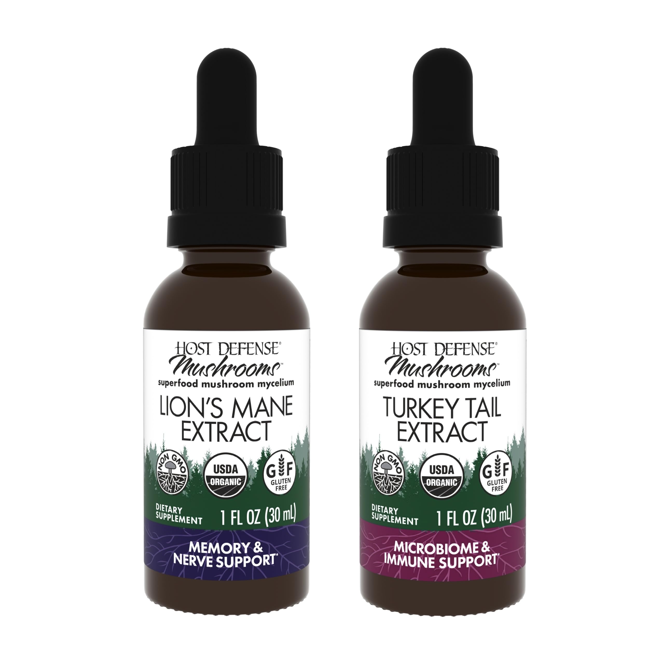 Explore the numerous health benefits of mushrooms with this Host Defense bundle that includes Lion's Mane Extract & Turkey Tail Extract. Lion's Mane Extract Each drop supports focus, memory, and cognition. Our supplement supports brain health and function, nervous system function, and immune system health. Lion's Mane, known as "The Smart Mushroom," can support clarity and a positive attitude. Whether you're a professional looking to sharpen your focus, a student aiming to support your study sessions, or simply seeking to aid your memory, Lion's Mane is a thoughtful addition to your daily regimen.* Turkey Tail Extract Each herbal supplement serving supports the immune response and GI health with organic mushroom mycelium. Our Turkey Tail mushroom supplement supports immune system response, digestive health, and gut microbiome health. Turkey Tail is one of the most-studied mushroom species, known for supporting immune cells and an engaged immune response. This prebiotic herbal supplement also supports the probiotic microflora in the gut microbiome for digestive health support.* Powered by organic mushroom mycelium, Host Defense products don't contain any fillers and are third-party tested for quality and safety.* Fungi Perfecti, makers of Host Defense Mushrooms, is a family owned company founded in 1980 by renowned mycologist Paul Stamets with the goal of building the connection between health and beneficial fungi. Our certified organic mushroom mycelium and fruit bodies are grown at our farm near the Olympic Rainforest in Washington State and are sustainably cultivated from responsibly cultured wild strains.* Our mycelium-based mushroom products are non-GMO, gluten-free, and vegan. We are a certified B Corporation and we use eco-conscious packaging that aligns without 110% Climate Positive Commitment. Our continued mission is to explore, study, preserve, and spread knowledge about the use of fungi to help bees, trees, people, and the planet.*"About Host Defense: Host Defense Mushrooms was founded by renowned mycologist Paul Stamets; our mushroom mycelium is certified organic, non-GMO, gluten-free, and grown in the USA*. Digestive Health & Immune Support Supplement: Turkey Tail Extract is formulated with Turkey Tail; our extract is enriched with prebiotics, bolstering the gut microbiome to maintain your digestive health and gastrointestinal harmony*. Mushroom Supplement for Health Support: Turkey Tail Extract, an herbal mushroom supplement, supports digestive and gastrointestinal health and immune system response*. Dietary Supplement with Mushroom Mycelium: Lion's Mane Extract, a brain and focus support supplement, is formulated with Lion's Mane, "The Smart Mushroom," for daily brain support*. Lion's Mane for Brain Support: Lion's Mane Extract, a mushroom supplement, supports immune and nervous system health as well as brain health, making it an ideal dietary supplement for those wanting to aid their focus and memory*.