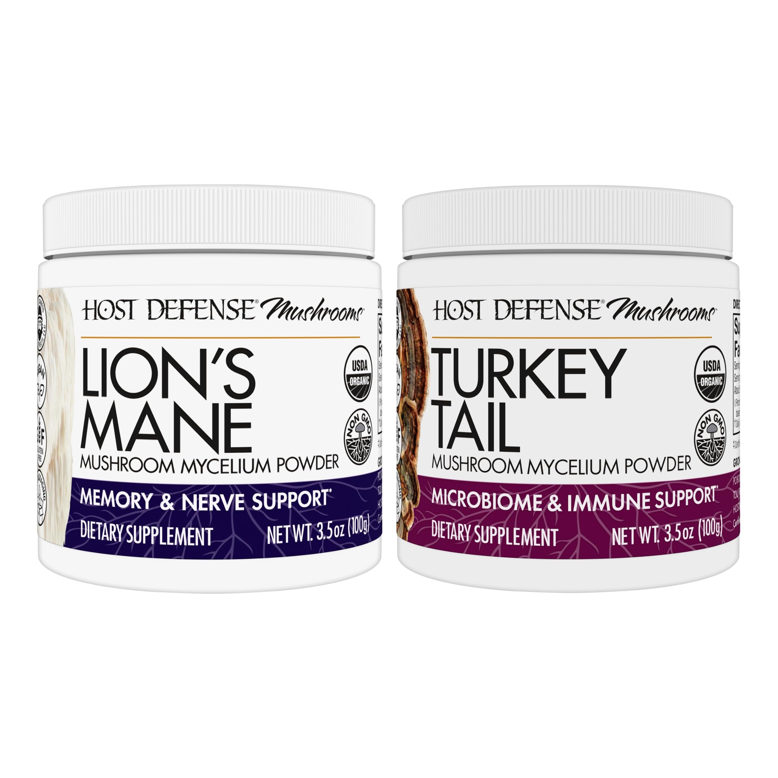 Explore the numerous health benefits of mushrooms with this Host Defense bundle that includes Lion's Mane Powder and Turkey Tail Powder. Lion's Mane Powder Each serving supports focus, memory, and brain health. Our supplement supports brain health and function, nervous system function, and immune system health. Lion's Mane has been revered for centuries, and now you can experience the support it offers for clarity and a positive attitude. Whether you're a professional looking to sharpen your focus, a student aiming to support your study sessions, or simply seeking to aid your memory, Lion's Mane is a thoughtful addition to your daily regimen.* Turkey Tail Powder Each serving supports the immune response and GI health with organic mushroom mycelium. Our supplement supports immune system response, digestive health, and gut microbiome health. Turkey Tail is one of the most-studied mushroom species, known for supporting immune cells and an engaged immune response. This supplement also supports the probiotic microflora in the gut microbiome for digestive health support.* Powered by organic mushroom mycelium, Host Defense products don't contain any fillers and are third-party tested for quality and safety.* Fungi Perfecti, makers of Host Defense Mushrooms, is a family owned company founded in 1980 by renowned mycologist Paul Stamets with the goal of building the connection between health and beneficial fungi. Our certified organic mushroom mycelium and fruit bodies are grown at our farm near the Olympic Rainforest in Washington State and are sustainably cultivated from responsibly cultured wild strains.* Our mycelium-based mushroom products are non-GMO, gluten-free, and vegan. We are a certified B Corporation and we use eco-conscious packaging that aligns without 110% Climate Positive Commitment. Our continued mission is to explore, study, preserve, and spread knowledge about the use of fungi to help bees, trees, people, and the planet.*"About Host Defense: Host Defense Mushrooms was founded by renowned mycologist Paul Stamets; our mushroom mycelium is certified organic, non-GMO, gluten-free, and grown in the USA*. Digestive Health & Immune Support Supplement: Turkey Tail Powder is formulated with prebiotics, bolstering the gut microbiome to maintain your digestive health and gastrointestinal harmony*. Mushroom Supplement for Health Support: Turkey Tail Powder, an herbal mushroom supplement, supports digestive and gastrointestinal health and immune system response*. Dietary Supplement with Mushroom Mycelium: Lion's Mane Powder, our brain and focus support supplement, is formulated with Lion's Mane, "The Smart Mushroom," for daily brain support*. Mushroom Supplement Powder for Brain Support: Lion's Mane supports immune and nervous system health as well as brain health, making it an ideal dietary supplement for those wanting to aid their focus and memory*.