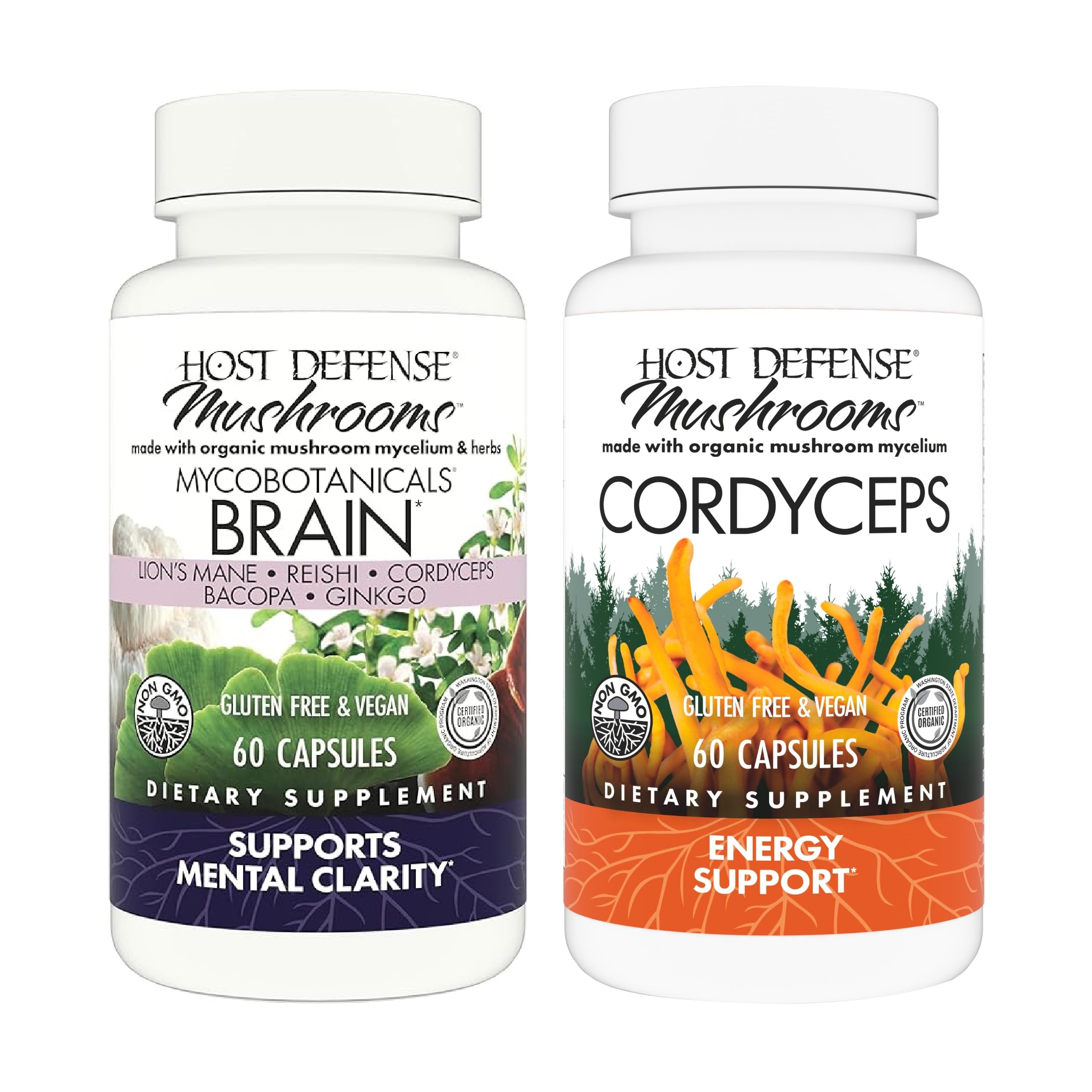 Explore the numerous health benefits of mushrooms with this Host Defense bundle that includes MycoBotanicals Brain* Capsules and Cordyceps Capsules. MycoBotanicals Brain* Capsules Our carefully crafted blend of Lion's Mane, Reishi, and Cordyceps mushroom supplement supports brain and adrenal functions. Lion's Mane supports brain health, clarity, and focus. Reishi supports neurological and adrenal functioning. This herbal supplement is also formulated with Cordyceps to support brain health while aging. The supplement formula has Bacopa and Ginkgo for additional brain health support.* Cordyceps Capsules Each Cordyceps mushroom supplement supports energy and stamina, as well as kidney health, lung health for fitness performance, and brain health with aging. Cordyceps is a beneficial mushroom that has traditionally been used to support immune health and overall health during high-altitude activities. This mushroom supplement is great for supporting the health of athletes or casual gym goers.* Powered by organic mushroom mycelium, Host Defense products don't contain any fillers and are third-party tested for quality and safety.* Fungi Perfecti, makers of Host Defense Mushrooms, is a family owned company founded in 1980 by renowned mycologist Paul Stamets with the goal of building the connection between health and beneficial fungi. Our certified organic mushroom mycelium and fruit bodies are grown at our farm near the Olympic Rainforest in Washington State and are sustainably cultivated from responsibly cultured wild strains.* Our mycelium-based mushroom products are non-GMO, gluten-free, and vegan. We are a certified B Corporation and we use eco-conscious packaging that aligns without 110% Climate Positive Commitment. Our continued mission is to explore, study, preserve, and spread knowledge about the use of fungi to help bees, trees, people, and the planet.*"About Host Defense: Host Defense Mushrooms was founded by renowned mycologist Paul Stamets; our mushroom mycelium is certified organic, non-GMO, gluten-free, and grown in the USA*. Dietary Mushroom Supplement: Cordyceps supports antioxidant activity and lung health for fitness performance and overall health*. Immune & Energy Support Supplement: Cordyceps, an excellent mushroom supplement, supports healthy oxygen uptake, immune system function, and healthy kidney function*. Dietary Supplement with Reishi Mushroom: MycoBotanicals Brain* is a support supplement that's formulated with Lion's Mane, "The Smart Mushroom," Reishi mushroom, and Cordyceps mushroom*. Lion's Mane for Brain Support: MycoBotanicals Brain* is an herbal mushroom supplement that supports brain health, neurological functioning, and adrenal functioning*.