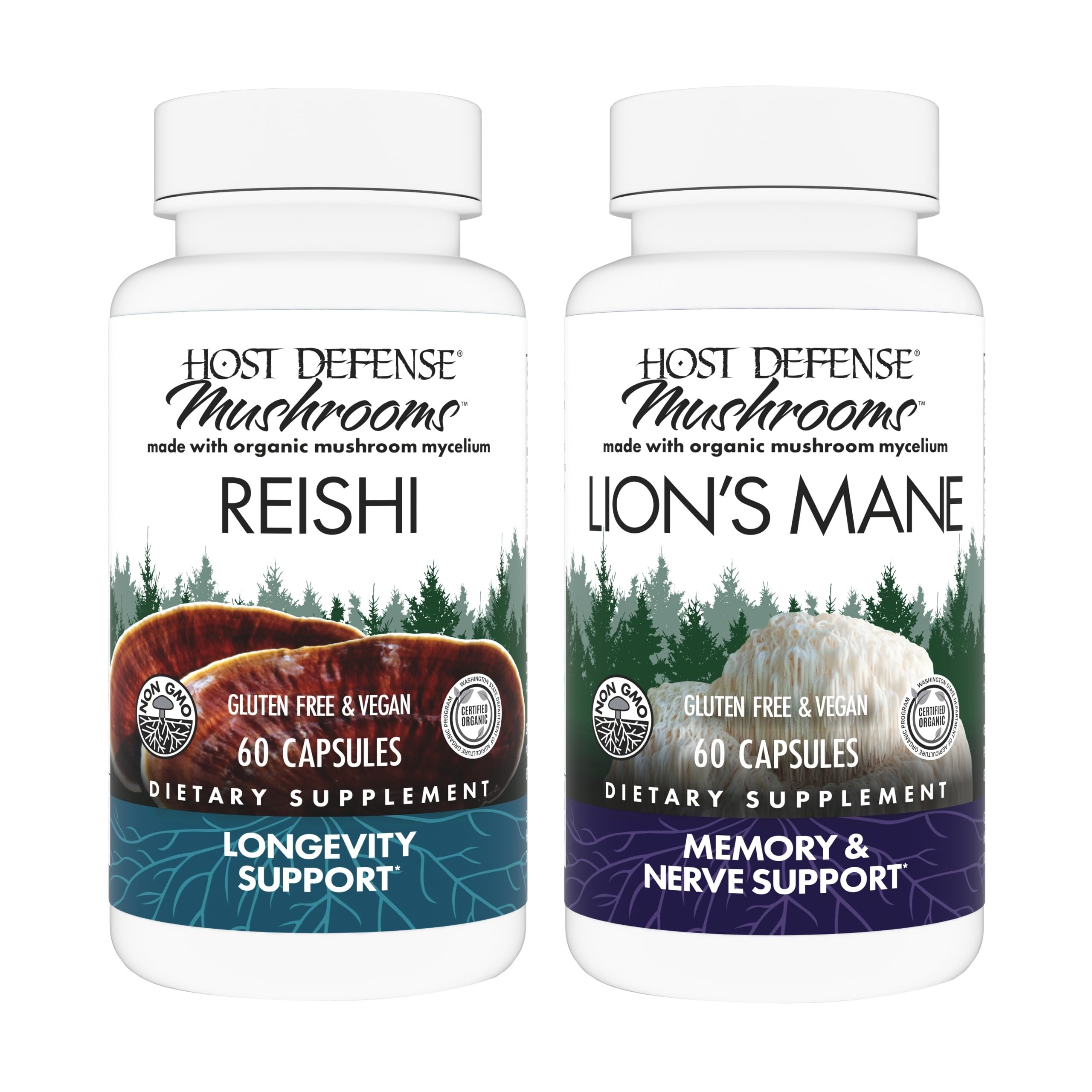 Explore the numerous health benefits of mushrooms with this Host Defense bundle that includes Reishi Capsules and Lion's Mane Capsules. Reishi Capsules Each serving supports heart and immune health with organic mushroom mycelium. Our supplement supports cardiovascular function, energy, stamina, and a healthy immune response. Reishi, known as "The Mushroom of Immortality,” supports whole-body wellness. It's also shown to support a relaxed body and mind.* Lion's Mane Capsules Each capsule supports focus, memory, and cognition. Our Lion's Mane supplement supports brain health and function, nervous system function, and immune system health. Lion's Mane offers support for clarity and a positive attitude. Whether you're a professional looking to sharpen your focus, a student aiming to support your study sessions, or simply seeking to aid your memory, Lion's Mane is a thoughtful addition to your daily regimen.* Powered by organic mushroom mycelium, Host Defense products don't contain any fillers and are third-party tested for quality and safety.* Fungi Perfecti, makers of Host Defense Mushrooms, is a family owned company founded in 1980 by renowned mycologist Paul Stamets with the goal of building the connection between health and beneficial fungi. Our certified organic mushroom mycelium and fruit bodies are grown at our farm near the Olympic Rainforest in Washington State and are sustainably cultivated from responsibly cultured wild strains.* Our mycelium-based mushroom products are non-GMO, gluten-free, and vegan. We are a certified B Corporation and we use eco-conscious packaging that aligns without 110% Climate Positive Commitment. Our continued mission is to explore, study, preserve, and spread knowledge about the use of fungi to help bees, trees, people, and the planet.*"About Host Defense: Host Defense Mushrooms was founded by renowned mycologist Paul Stamets; our mushroom mycelium is certified organic, non-GMO, gluten-free, and grown in the USA*. Dietary Supplement with Mushroom Mycelium: Lion's Mane, a brain and focus support supplement, is formulated with Lion's Mane, "The Smart Mushroom," for daily brain support*. Mushroom Supplement for Brain Support: Lion's Mane supports immune and nervous system health as well as brain health, making it an ideal dietary supplement for those wanting to aid their focus and memory*. Herbal Vitality Supplement: Reishi, an herbal mushroom supplement, is made with Reishi, "The Mushroom of Immortality," to support overall wellness and vitality*. Immune & Energy Support Supplement: Reishi, an herbal mushroom supplement, supports immune health, heart health, and daily energy and stamina*.
