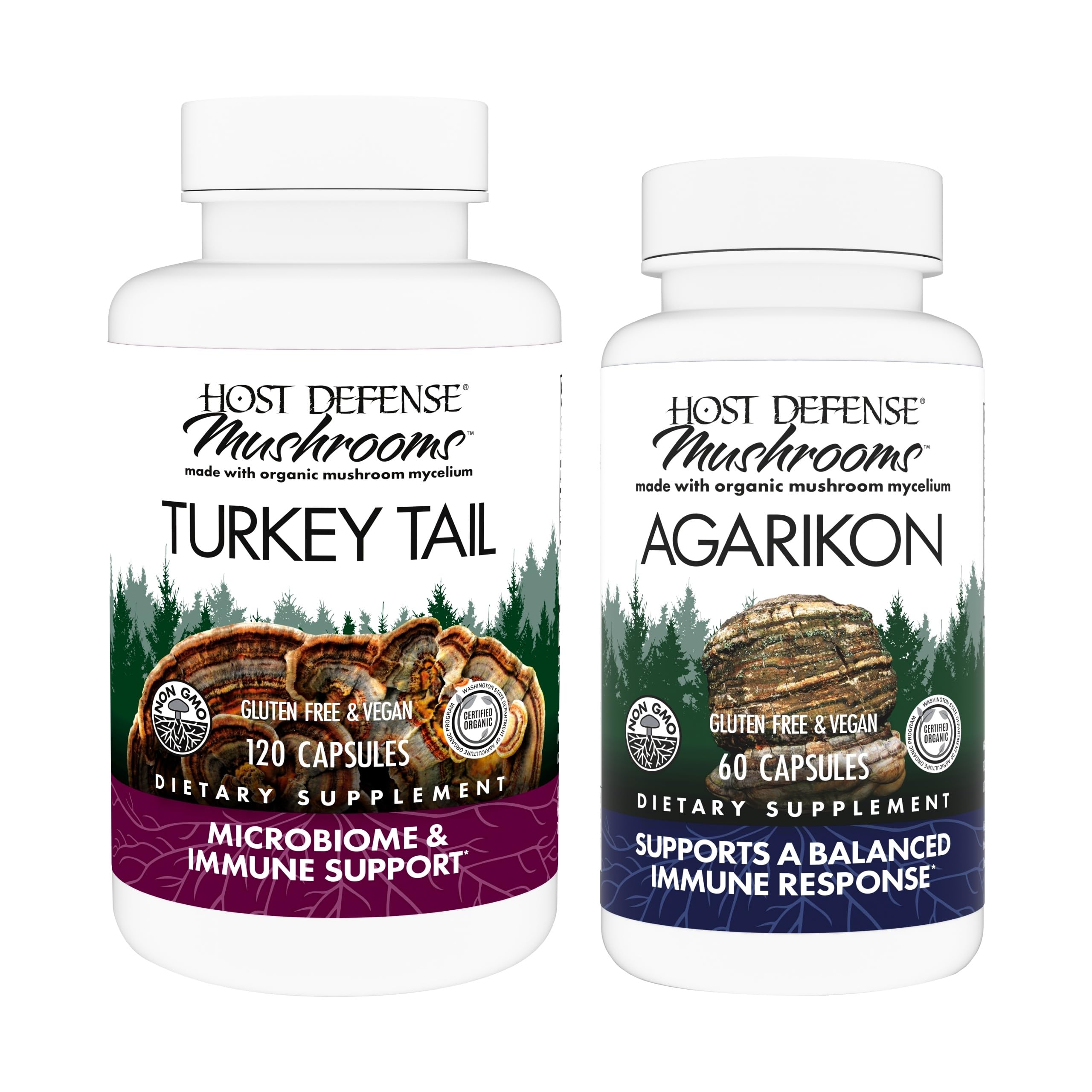 Explore the numerous health benefits of mushrooms with this Host Defense bundle that includes Turkey Tail Capsules and Agarikon Capsules. Turkey Tail Capsules Each serving supports the immune response and GI health with organic mushroom mycelium. Our supplement supports immune system response, digestive health, and gut microbiome health. Turkey Tail is one of the most-studied mushroom species, known for supporting immune cells and an engaged immune response. This prebiotic herbal supplement also supports the probiotic microflora in the gut microbiome for digestive health support.* Agarikon Capsules Powered by organic mushroom mycelium, each vegan capsule supports an engaged and balanced immune system response. Our Agarikon is responsibly sourced and sustainably cultured. Our capsules support immune system functions, immune cell strength, and immune regulation. Agarikon, known as "The Elixir of Long Life," offers unique support for a powerfully engaged, yet balanced immune response. This makes it a great herbal supplement to consider adding to your health routine.* Powered by organic mushroom mycelium, Host Defense products don't contain any fillers and are third-party tested for quality and safety.* Fungi Perfecti, makers of Host Defense Mushrooms, is a family owned company founded in 1980 by renowned mycologist Paul Stamets with the goal of building the connection between health and beneficial fungi. Our certified organic mushroom mycelium and fruit bodies are grown at our farm near the Olympic Rainforest in Washington State and are sustainably cultivated from responsibly cultured wild strains.* Our mycelium-based mushroom products are non-GMO, gluten-free, and vegan. We are a certified B Corporation and we use eco-conscious packaging that aligns without 110% Climate Positive Commitment. Our continued mission is to explore, study, preserve, and spread knowledge about the use of fungi to help bees, trees, people, and the planet.*"About Host Defense: Host Defense Mushrooms was founded by renowned mycologist Paul Stamets; our mushroom mycelium is certified organic, non-GMO, gluten-free, and grown in the USA*. Herbal Immune Supplement with Mushroom: Agarikon, our immune support supplement, is formulated with Agarikon, "The Elixir of Long Life," to support immune system regulation*. Immune Support Supplement: Agarikon, a mushroom supplement, supports immune system functions and immune cell strength, aiding the overall balance of the immune system*. Digestive Health & Immune Support: Turkey Tail capsules are enriched with prebiotics, bolstering the gut microbiome to maintain your digestive health and gastrointestinal harmony*. Mushroom Supplement for Health Support: Turkey Tail, an herbal mushroom supplement, supports digestive and gastrointestinal health and immune system response*.