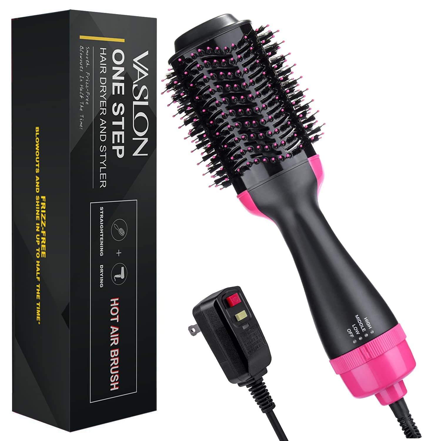 SAFETY FIRST - Equipped with ALCI safety Plug,Double protection circuit design provide reliable overheating and over-current protection.It will be automatically activated when short circuit or leakage of electricity happens to ensure safety. Don't worry our warranty 35 no-questions-asked return policy and 1-Year manufacturer's warranty. ERGONOMIC SAFE GRIP HANDLE - The 360 rotatable wiree nsures high flexibility to move freely without the cord becoming tangled and damaged, great for using at home or traveling. The hot air brush has unique shape gently curved sides for smoothing and round edges for smooth volume and curled ends. The nylon pin tufted bristles for easy detangle better grip of your hair.For maximum comfort and ease of use during styling. IONIC TECHNOLOGY- Negative ions saturate the airflow to reduce the size of water droplets for faster drying. This helps condition, smooth, natural lustrous look and make your hair shinier, while reducing frizz and static, preventing hair damage. ADJUSTABLE TEMPERATURE - The bottom is a rotary adjustment gear switch, which can be adjusted to the current working state by rotation, and 3 gear positions are set:HIGH,LOW,COOL to meet your different needs. Efficient fast styling, less time, less damage. MULTI-FUNCTION HAIR DRYER BRUSH - This hot air brush is a perfect combination of hair dryer and hair styler to help you dry and straighten and curl your hair at the same time. For all types of hair. Long, short, thick, damaged, colored, or extensions, can be made in different shapes.