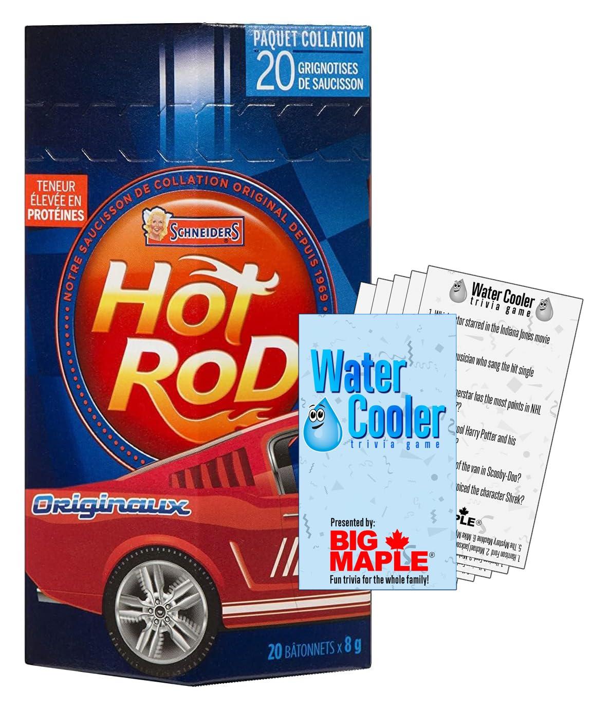 Hot Rod Sausage Snacks Bundle. Includes (1) Package of Schneiders Hot Rod Sausage Snacks Original Flavour (20 total individual sticks) with Water Cooler Trivia Game by BIG MAPLE to Enjoy with your Snack