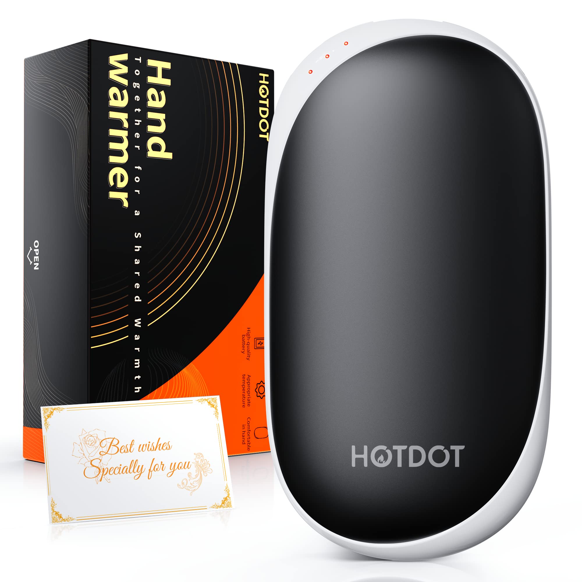 ?It is the best gift choice?It should be on your gift list. This winter, you can give it to a friend who loves outdoor activities or to a Raynaud's arthritis patient who needs heat therapy. Please spread the warmth to all your loved ones around you. (Finally, if you encounter any problem in using it, please contact us and we will provide you with good after-sales service). ?Perfect product design?Compact, small size, light weight, easy to carry, stylish appearance, comfortable grip, simple and practical design, just one key operation, also can be used as a power bank to provide emergency power for your electronic devices. You will fall in love with it. ?Double-sided fast heating?Press and hold the switch for 3 seconds to release heat quickly, heat dissipation is balanced, intelligent monitoring of heating temperature at any time, three grades for your choice (low temperature 104-113°F, medium temperature 113-122°F, high temperature 122-131°F). ?Intelligent protection system?Provide over-discharge, over-charge, over-heat and short-circuit protection, with advanced anodized surface, made of high-tech aircraft-grade aluminum and ABS, good thermal conductivity, tight density and drop-proof. Enjoy the comfort and warmth that comes with safety. ?Why to buy this product?Hotdot rechargeable hand warmer is the best choice for your winter warming, built-in intelligent protection system, high capacity and high quality battery, safe and reliable, double-sided fast heating, no waiting, perfect design, compact and convenient, one button simple operation, meet all your needs. Of course, it is also a perfect christmas gifts.Recommended Uses For Product: Outdoor. Power Source: Hand,Hand Warmers,Electric. Material: Aluminum. Color: Noble Black. Brand: Hotdot. Date First Available: July 21, 2022. Best Sellers Rank: #51,753 in Sports & Outdoors. Customer Reviews: 4.5 out of 5 stars 751 ratings 4.5 out of 5 stars. : B0B77VVB9X. Manufacturer: ?Dongguan Hongyutai Electronics CO., Ltd. Suggested Users: ?unisex-adult. Model Name: ?OT-93. Warranty Description: ?Three Mouth. Brand Name: ?Hotdot. Package Weight: ?0.23 Kilograms. Item Package Dimensions L x W x H: ?5.31 x 3.27 x 1.46 inches. Reusability: ?Rechargeable. Included Components: ?no. Charging Time: ?10 Hours. Battery Description: ?Lithium Ion. Recommended Uses For Product: ?Outdoor. Power Source: ?Hand,Hand Warmers,Electric. Material: ?Aluminum. Color: ?Noble Black. Brand: ?Hotdot.