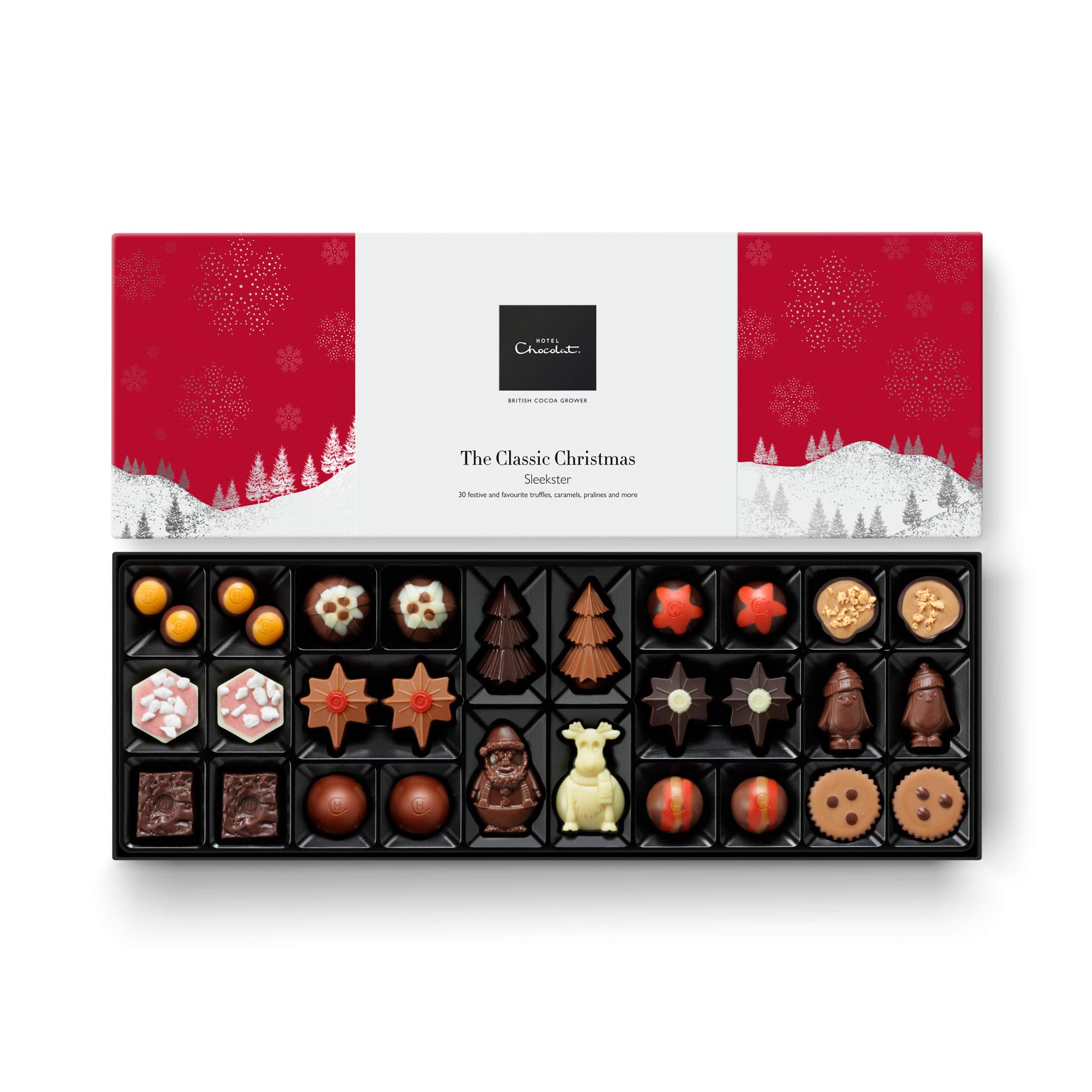 A Christmas chocolate box filled with festive and popular chocolates that the whole family can share—yours or hers. Expect seasonal classics like Christmas, mulled wine, and clementine, as well as bestsellers like brownie, champagne, and melted caramel penguin. The perfect gift for her to enjoy (or to stand out with the party movie night). INGREDIENTS Ingredients: Cocoa solids (cocoa mass, cocoa butter), sugar, whole milk powder, caramel (glucose-fructose syrup, sweetened condensed milk, semi-salted butter (from milk), sugar, salt, emulsifier (soy lecithin)), stabilizers (sorbitol, glycerin), whipped cream (cream), stabilizer (caramelized fat)), butter oil (from milk), pecan paste, glucose syrup, skimmed milk powder, almond paste, cashew paste (cashew nut, rapeseed oil), port wine (sulfites), chopped pecans, vegetable fats (coconut, shea, sunflower), emulsifiers (soy lecithin, sunflower lecithin), corn flakes (ground corn, sugar, malt flavoring (from barley)), concentrated fruit juices (Blackberry, raspberry), neutral alcohol, meringue pieces (sugar, cocoa butter, WHEAT starch, protein), invert sugar syrup, cream (from MILK), caramelized sugar, can, cose, cose. Ranunberry green octopus, champagne (SULFITE), ground cinnamon, natural colors (beetroot, annatto, bell pepper, carotene), cinnamon paste (glucose syrup, cinnamon, sugar coloring, aromatic oil (cinnamon)), amaretti biscuits (sugar, WHEAT flour, apricot kernels, protein, leavening (sodium bicarbonate, ammonium bicarbonate)), flavorings, concentrated whey (from MILK), lactose (from MILK), sea salt, ground nutmeg, acidity regulator (citric acid), MILK proteins, essential oils (clementine, bitter orange, allspice), honey powder. SAFETY WARNING Do not expose to direct sunlight. See moreHotel Chocolat The Classic Christmas Sleekster 320 gDESCRIPTION DU PRODUIT DESCRIPTION DU PRODUIT Une boîte à chocolats de Noël pleine de chocolats festifs et populaires que toute la famille peut partager - votre ou votre vôtre. Attendez-vous à des classiques saisonniers tels que Noël, vin chaud et clémentine, ainsi que des best-seller comme le brownie, le champagne et le pingouin caramel fondu. Le cadeau parfait pour elle pour s'amuser (ou se démarquer avec le film festif de la soirée). INGRÉDIENTS Ingrédients: masse sèche de cacao (pâte de cacao, beurre de cacao), sucre, lait entier en poudre, caramel (sirop de glucose-fructose, LAIT condensé sucré, beurre semi-salé (à partir du LAIT), sucre, sel, émulsifiant (lécithine de SOJA)), stabilisants (sorbitol, glycérine), crème fouettée (crème ), stabilisateur (Car. rageen)), huile de beurre (du LAIT), pâte de noix de PECAN, sirop de glucose, lait écrémé en poudre, pâte d'amande, pâte de cajou (noix de CACHÉ, huile de colza), vin de porto (Sulfites), noix de PECAN hachées, graisses végétales (noix de coco, karité, tournesol), émulsifiants (Lécithme de soja dans, lécithine de tournesol), flocons de maïs (maïs moulu, sucre, arôme de malt (d'orGE)), jus de fruits concentrés (mûre, framboise), alcool neutre, morceaux de meringue (sucre, beurre de cacao, amidon de BLÉ, protéines), sirop de sucre inverti, crème (au LAIT), sucre caramélisé, can, cose, cose Poulpe de ranberry ver, champagne (SULFITE), cannelle moulue, colorants naturels (betterave, annatto, poivron, carotène), pâte de cannelle (sirop de glucose, cannelle, colorant de sucre, huile aromatique (cannelle)), biscuits amaretti (sucre, farine de BLÉ, noyaux d'abricot, protéines, levure (bicarbonate de sodium, bicarbonate de mmonium at)), arômes, lactosérum concentré (à partir du LAIT), lactose (du LAIT), sel de mer, muscade moulue, régulateur d'acidité (acide citrique), protéines du LAIT, huiles essentielles (clémentine, orange amère, feuilles de Jamaïque), poudre de miel. AVERTISSEMENT DE SÉCURITÉ Ne pas exposer à la lumière directe du soleil. Voir plus