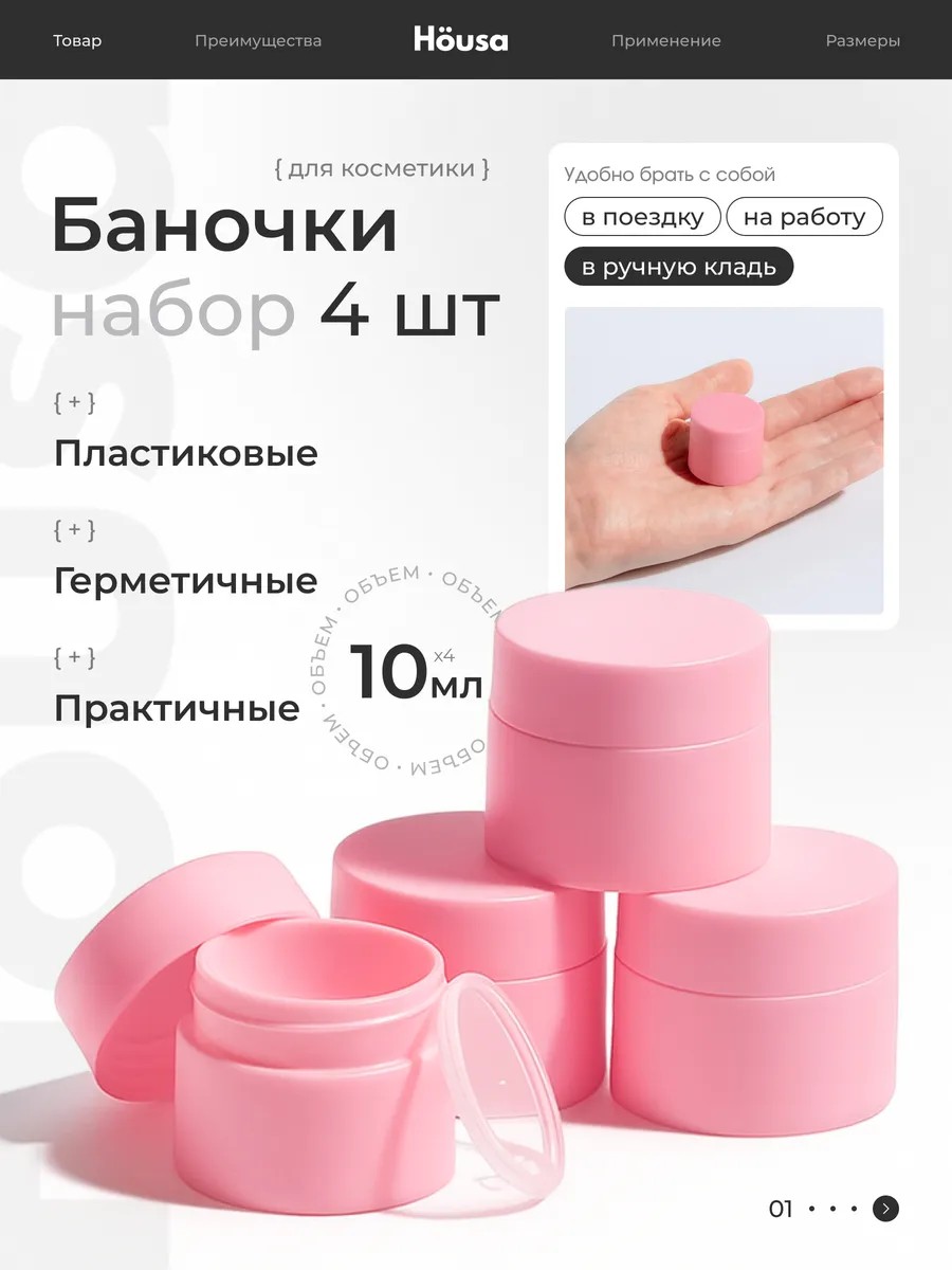 Если ты часто в поездках, то эти мини контейнеры станут настоящим спасением! Они идеально помещаются в дорожный органайзер и не займут много места; сделаны из качественного пластика, который не только легкий, но и прочный. Это значит, что даже если ты уронишь баночку, с ней ничего не произойдет. Крышка плотно закрывается, так что никакие жидкости не прольются в твоей косметичке даже в самолете.