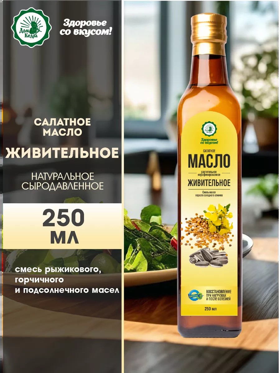Салатное масло Живительное от Дом Кедра – это уникальная смесь натуральных сыродавленных нерафинированных масел: рыжикового, горчичного и подсолнечного, которая является источником здоровья и поможет восстановиться при нагрузках и после болезней.