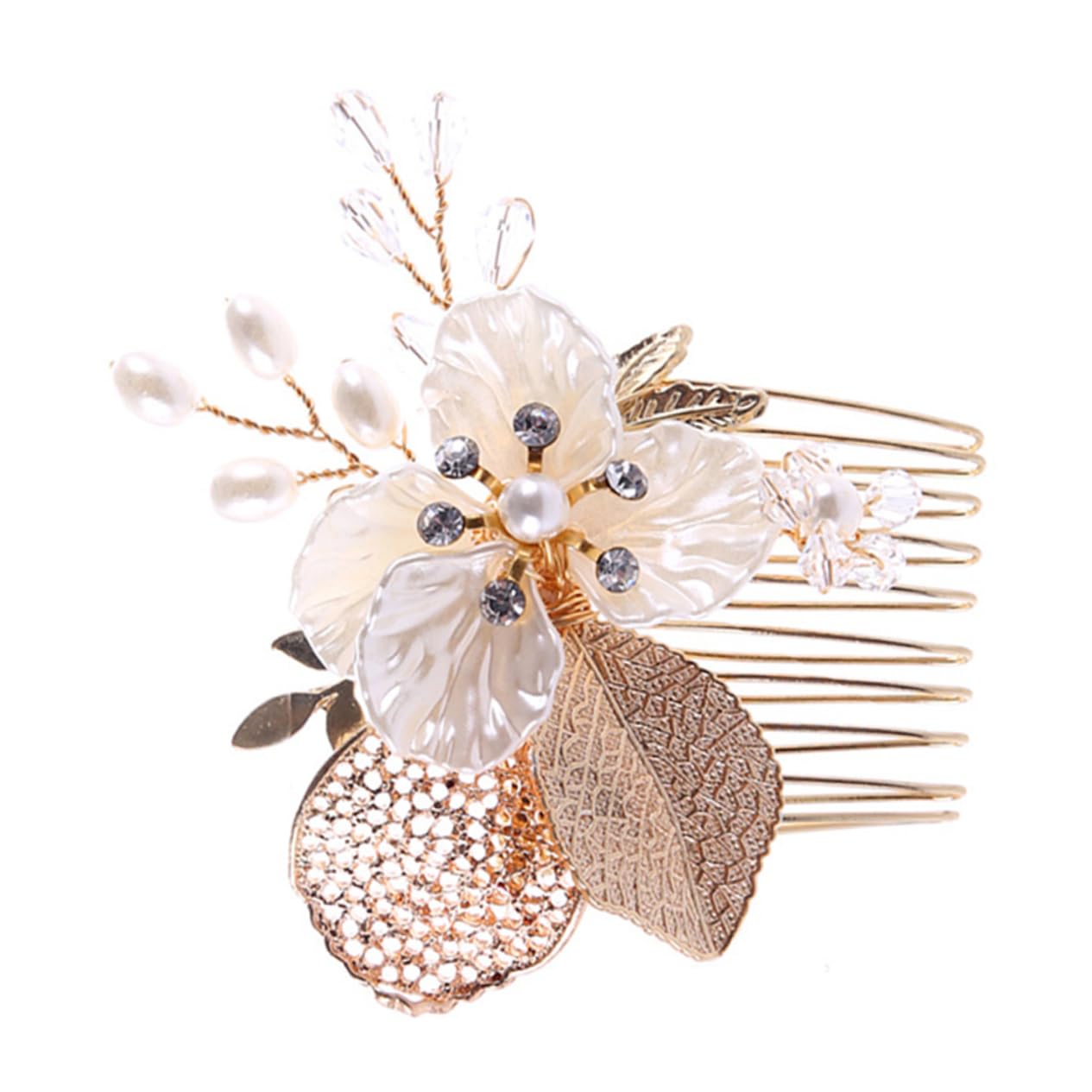 Package List 1 x Hair Comb Characteristics - Color: Golden Wedding Hair Comb. - Size: About 7x5.5x1.5cm Bridal Comb. - Material: Metal, rhinestone, manmade pearl. - Special for wedding, party, prom, party, engagement, anniversary or other special occasions Bridal Hair Comb. - Suitable for most women, ladies and girls to wear Hair Comb. - Decorated with pearl to make it more beautiful and attractive Women Hair Accessory. - It's extremely luxurious looking with workmanship Bride Insert Comb. - Simple and practical design, and easy to use. Goods Information headpiece for bride Great for bride, bridesmaid, flower girls or wear it to a party.bride headpiece This bridal hair comb is made of material.Bride Insert This exquisite designed hair comb is a alternative for headpiece such as crown, tiara or headband