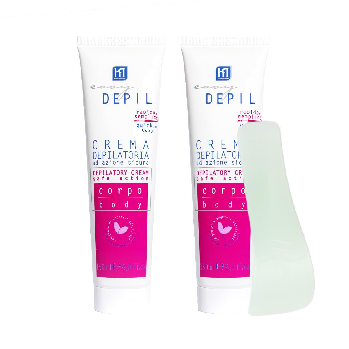 Easy Depil hair removal cream for the body and legs provides easy, painless, and effective hair removal by gently and quickly removing unwanted hair while respecting the skin. Ideal for those who want to remove hair without tearing, it is suitable for all skin types, even particularly dry and sensitive skin prone to bruising or post-hair removal folliculitis. Its exclusive, dermatologically tested formula ensures maximum safety and tolerance. Enriched with soothing plant proteins, it leaves the skin on the body and legs soft, smooth, and velvety for a long time. Ready to use, its very soft texture allows for even application and easy removal, and is pleasant to use thanks to its delicate fragrance. It works in 5 minutes and can also be used on the arms. Inside the box is a practical and flexible spatula for easy and convenient application and removal of the cream. 100 Italian-made product, designed, formulated, and manufactured in Italy at the Betafarma S.p.A. factory in Cesano Boscone (MI). Contents: 1 x 150ml tube of cream and 1 precision spatulaReady to use: Apply with the curved end of the spatula included in the box to completely and evenly cover the area to be depilated. Leave the cream on for 5 minutes, then remove with the spatula and rinse the depilated area thoroughly with water. Pleasant fragrance: This depilatory cream for the body, legs, and arms is pleasant to use thanks to a delicate fragrance that ensures no lingering unpleasant odors. Dermatologically tested: For maximum safety and tolerance, even on delicate and sensitive skin, thanks to the presence of soothing, moisturizing, and nourishing plant proteins in the formula. Fast and painless action: Just 5 minutes is enough to effectively, painlessly, and quickly remove unwanted hair from the body, legs, and arms while fully respecting the skin. Depilatory cream for the body, legs, and arms: For smooth and soft skin that lasts. Kit of two 150ml tins of body hair removal cream.Easy Depil KIT 2 PIÈCES CRÈME ÉPILATOIRE CORPS Jambes Bras de 150 ml Rapide, simple à utiliser, efficace et sûr avec protéines végétales adoucissantes. Peau lisse, parfum agréable, unisexeDESCRIPTION DU PRODUIT La crème épilatoire pour le corps et les jambes Easy Depil permet une épilation facile, indolore et efficace en éliminant de manière délicate et rapide les poils superflus dans le respect total de la peau. Idéal pour ceux qui souhaitent enlever les poils en évitant les traumatismes de déchirure, il convient à tous les types de peaux même celles particulièrement sèches et les plus sensibles, sujettes aux hématomes ou aux folliculite post-épilation. Mérite d'une formule exclusive testée dermatologiquement, pour une sécurité et une tolérance maximales, enrichie en protéines végétales adoucissantes qui laisse la peau du corps et des jambes douce, lisse et veloutée pendant longtemps. Prête à l'emploi, sa texture très douce offre une application homogène et un retrait facile et est agréable à utiliser grâce à un parfum délicat. Agit en 5 minutes, peut également s'utiliser sur les bras. À l'intérieur de la boîte la spatule spéciale pratique et flexible, pour appliquer et enlever la crème de manière facile et facile. Produit 100 fabriqué en Italie conçu, formulé et fabriqué en Italie dans l'usine de Betafarma S.p.A à Cesano Boscone (MI). Contenu : 1 tube de crème de 150 ml et 1 spatule de précisionPrêt à l'emploi : s'applique avec la partie incurvée de la spatule, présente dans la boîte, pour couvrir complètement uniformément la zone à épiler. Laisser agir la crème pendant 5 minutes, puis retirer avec la spatule et rincer abondamment la zone épilée avec de l'eau. Parfum agréable : cette crème dépilatoire pour le corps, les jambes et les bras est agréable à utiliser grâce à un parfum délicat qui assure l'absence de mauvaises odeurs persistantes. Testé dermatologiquement : pour une sécurité maximale et une tolérance même sur les peaux délicates et sensibles, grâce à la présence en formule de protéines végétales à action apaisante, hydratante et nutritive. Action rapide et indolore : 5 minutes suffisent pour enlever les poils superflus du corps, des jambes et des bras de manière efficace, indolore et rapide dans le respect total de la peau. Crème dépilatoire corps, jambes et bras : pour une peau lisse et douce pendant longtemps. Kit de deux boîtes de crème épilatoire corps de 150 ml chacun.