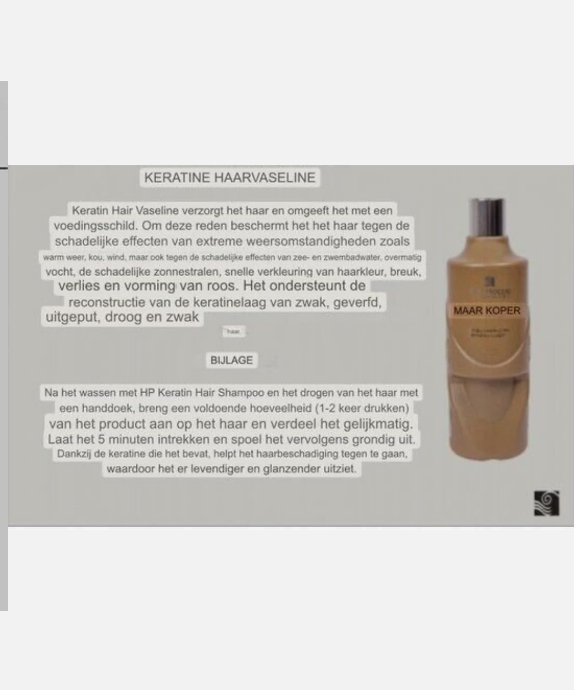 Keratin Hair Vaseline is a nourishing hair care product that protects the hair against the harmful effects of extreme weather conditions such as hot water, cold, wind and even chlorine and salt water. It supports the reconstruction of the keratin layer of the hair, making the hair look healthier, smoother and shinier. After washing with the HP Keratin Hair Shampoo, apply a small amount (1-2 presses) of this product evenly to the damp hair. Leave it on for 5 minutes and then rinse thoroughly. The keratin molecules help repair the hair and prevent further damage. INGREDIENTS Keratin SAFETY WARNING N A See moreMoisturizing: It helps repair dry, damaged and lifeless hair by providing it with essential nutrients and moisture. Nourishing Formula: The nourishing formula provides a vibrant appearance and silky shine. Simple Application: First wash with keratin shampoo, then apply a towel full of the product evenly to wet hair. Leave it on for 5 minutes and rinse thoroughly. Hair strengthening: It supports the reconstruction of the keratin layer, making the hair stronger, shinier and less brittle. Protective Keratin: This hair Vaseline contains keratin that nourishes the hair and protects it against harmful effects such as heat, cold, wind and moisture.Keratine Haarvaseline, Voedingsschild, Beschermt Tegen Schade, 250 ml Keratin Hair Vaseline is een voedende haarverzorgingsproduct dat het haar beschermt tegen schadelijke effecten van extreme weersomstandigheden zoals warm water, kou, wind en zelfs chloor- en zoutwater. Het ondersteunt de reconstructie van de keratinelaag van het haar, waardoor het haar er gezonder, gladder en glanzender uitziet. Na het wassen met de HP Keratin Hair Shampoo, breng je een kleine hoeveelheid (1-2 keer drukken) van dit product gelijkmatig aan op het vochtige haar. Laat het 5 minuten intrekken en spoel het vervolgens grondig uit. De keratinemoleculen helpen het haar te herstellen en voorkomen verdere beschadiging. INGREDIËNTEN Keratine VEILIGHEIDSWAARSCHUWING Nvt Meer bekijkenVochtherstellend: Het helpt droog, beschadigd en futloos haar te herstellen door het te voorzien van essentiële voedingsstoffen en vocht. Voedende Formule: De voedende formule zorgt voor een levendige uitstraling en zijdeachtige glans. Eenvoudige Toepassing: Was eerst met keratine shampoo, breng vervolgens een handdoekvolle van het product gelijkmatig aan op nat haar. Laat het 5 minuten intrekken en spoel grondig uit. Haarversteviging: Het ondersteunt de reconstructie van de keratinelaag, waardoor het haar steviger, glanzender en minder breekbaar wordt. Beschermende Keratine: Deze haarvaseline bevat keratine dat het haar voedt en beschermt tegen schadelijke effecten zoals hitte, kou, wind en vocht.