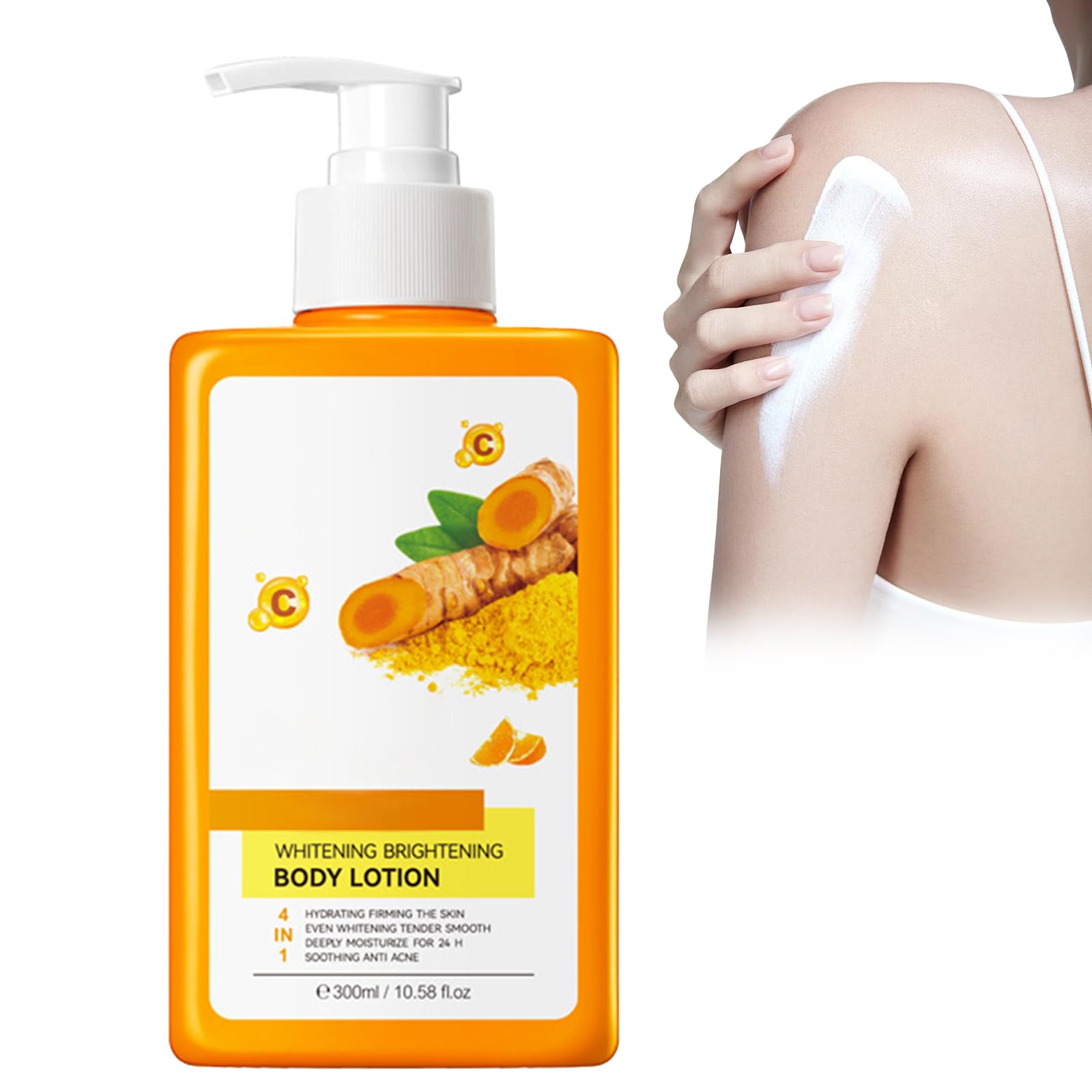 FOR ALL SKIN TYPES: Whether you have oily, dry, or combination skin, our body lotion will quickly nourish and hydrate your skin. We recommend testing the cream behind your ears or on your wrists to ensure there are no adverse reactions before applying it more liberally. Versatile Use: You can apply the body cream to your arms, stomach, face, neck, legs, or back. It nourishes, hydrates, and plumps the skin for a healthier, fuller, and more youthful complexion, while also improving elasticity. Easy to Use: Our body lotion is designed to be simple and easy to use. Just apply an appropriate amount to clean skin and massage gently until fully absorbed. The texture is light and leaves no greasy residue. Deep Hydration: Moisturizes and nourishes the skin. Its nourishing and creamy texture compensates for the skin's lack of hydration, improves the appearance of dry, rough, and dehydrated skin, and leaves it smooth and supple. TURMERIC BODY LOTION: This turmeric body lotion helps improve skin elasticity, restore collagen, and moisturize and nourish the skin, leaving it softer, more supple, and more radiant.Hppsctink Lait pour le corps au curcuma - 300 ml - Lait blanchissant pour le corps - Améliore la sécheresse et le teint - Hydratant - Peau lisse - CrèmePOUR TOUS LES TYPES DE PEAU : que vous ayez une peau grasse, sèche ou mixte, notre lotion pour le corps nourrira et hydratera rapidement votre peau. Il est recommandé d'essayer la crème derrière les oreilles ou sur les poignets pour s'assurer qu'il n'y a pas de réactions indésirables avant de l'appliquer généreusement. Utilisation polyvalente : vous pouvez appliquer la crème pour le corps sur les bras, le ventre, le visage, le cou, les jambes ou le dos. Nourrit, hydrate et repulpe la peau pour un teint plus sain, plus complet et plus jeune, tout en améliorant l'élasticité. Facile à utiliser : notre lotion pour le corps est conçue pour être simple et facile à utiliser. Il suffit d'appliquer une quantité appropriée sur une peau propre et de masser doucement jusqu'à ce qu'elle soit complètement absorbée. La texture est légère et ne laisse aucun résidu gras. Hydratation profonde : hydrate et nourrit la peau. Sa texture nourrissante et crémeuse compense le manque d'hydratation de la peau, améliore l'apparence de la peau sèche, rugueuse et déshydratée et la rend lisse et souple. TURMERIC BODY LOTION : cette lotion pour le corps au curcuma aide à améliorer l'élasticité de la peau, à restaurer le collagène dans la peau, à hydrater et à nourrir la peau, la rendant plus douce, plus souple et plus éclatante.