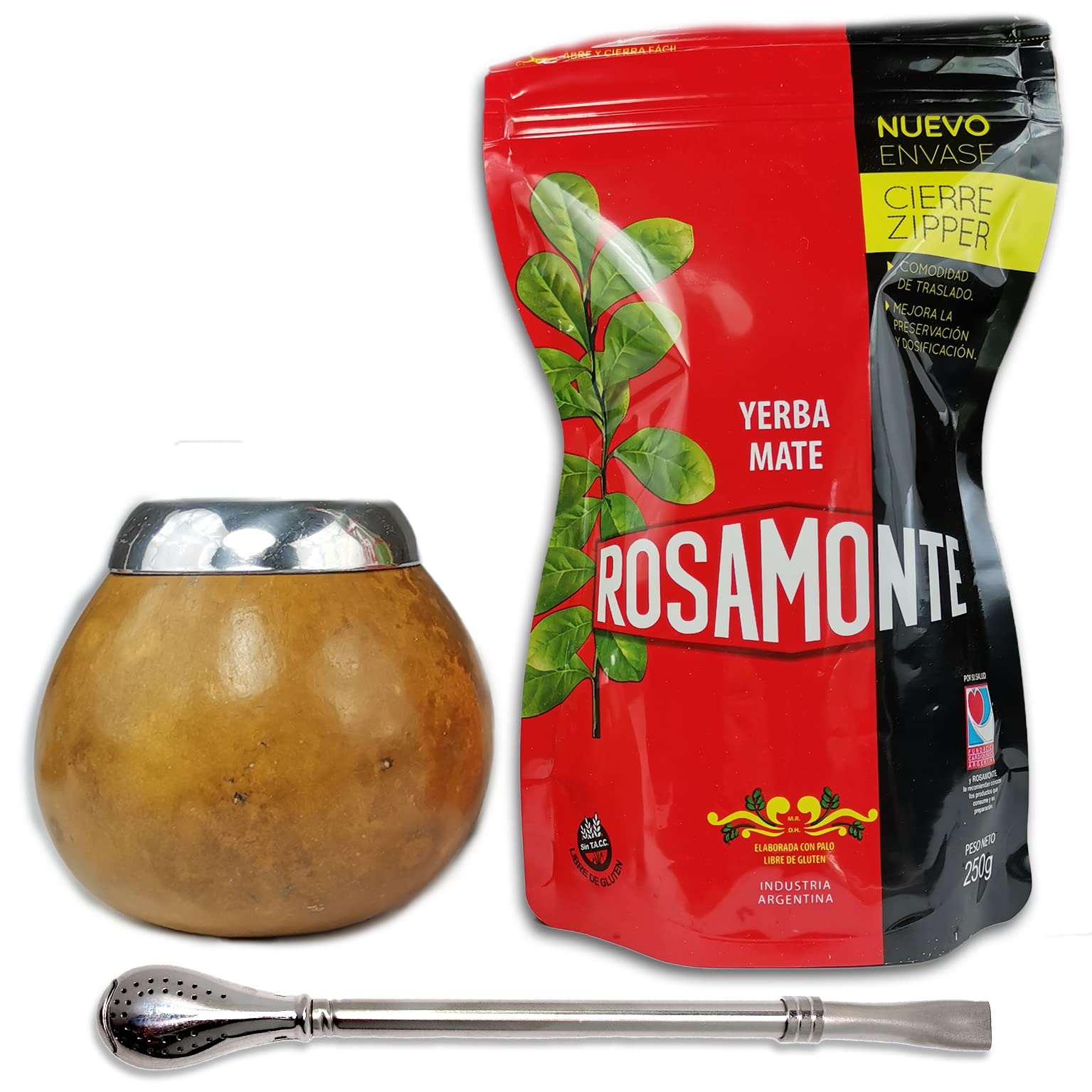 Hreniuk SA (Rosamonte) Rosamonte Yerba Mate Tea Set Traditional Zip 250g 1x Mate Cup Gourd Pumpkin leopard color Yerba Mate Tea Straw Bombilla Cleaning Brush Detox and Energy Drink
