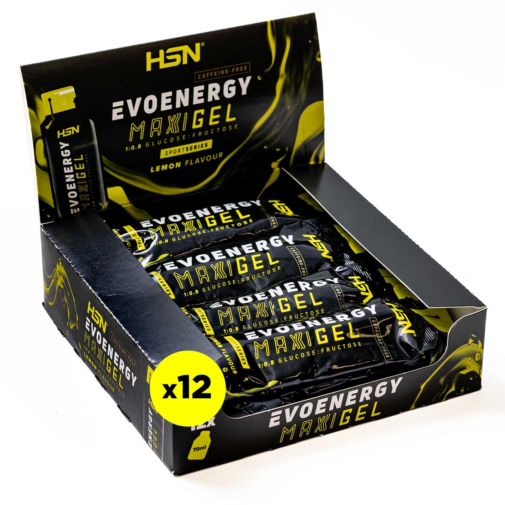 HSN Evonergy Maxigel without caffeine lemon 12 pieces of 70 ml 60 g carbohydrates per gel ratio 108 glucose fructose liquid texture no GMO vegan gluten and lactose free Maxi without caffeine Lemon