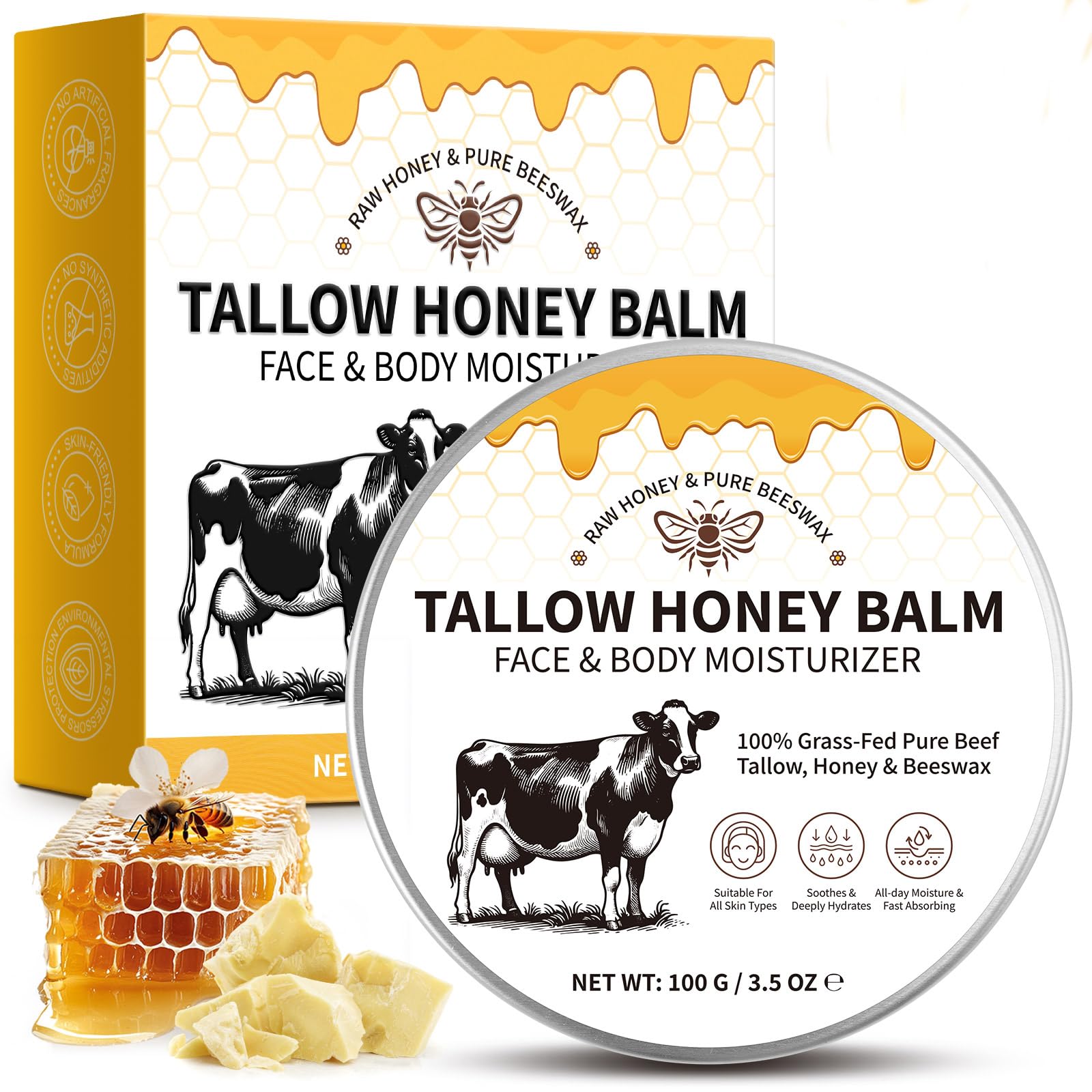 Beef Tallow for Skin: The Ultimate Natural Skincare Solution Discover the transformative power of our Beef Tallow for Skin, a luxurious, all-natural skincare product designed to deeply nourish, protect, and rejuvenate your skin. Crafted with care and simplicity, this multi-purpose balm is your go-to solution for achieving healthy, radiant, and youthful skin. Why Choose Our Beef Tallow for Skin? - 100 Natural : Made with grass-fed beef tallow, raw honey, and beeswax. - Suitable for All Skin Types : Gentle and non-irritating, even for sensitive skin. - Non-Greasy Fast-Absorbing : Lightweight formula that melts into your skin without leaving a greasy residue. - Cruelty-Free : Never tested on animals. How to Use? - For the Face: Apply a small amount to clean skin, gently massaging it in for deep hydration. - For the Body: Use on dry areas like elbows, knees, and heels for intense moisture. - For Hands Feet: Perfect as a hand cream or foot balm to soften and repair rough skin. - Overnight Treatment: Apply a thicker layer before bed for an intensive nourishing treatment. Note: For external use only. Perform a patch test before full application.Thoughtful Gift Choice: Looking for a thoughtful gift? Our Tallow Honey Balm is perfect for anyone, whether it's your partner, family, or friends. Its natural ingredients and skin-rejuvenating properties make it a cherished present that promotes youthful, healthy skin. A gift that keeps on giving!. Natural Non-Irritating: Made from natural butter and pure honey, our balm is free from harsh chemicals and irritants. It's lightweight, non-greasy, and absorbs quickly, making it suitable for all skin types, including those prone to acne or allergies. Enjoy the benefits of nature without any unwanted side effects. All-Over Body Care: Versatile and effective, our Tallow Honey Balm can be used on any part of your body. From your face to your hands, legs, and back, it provides deep moisturization. The added honey enhances its hydrating properties, ensuring your skin feels soft and smooth everywhere. Vitamin-Rich Formula: Packed with essential vitamins like A, D, E, K, and B12, our balm delivers a powerful nutritional boost to your skin. These vitamins promote healthy skin regeneration, enhance elasticity, and protect against environmental stressors, leaving your skin revitalized and glowing. Soothes Sensitive Skin: Perfect for sensitive skin, our balm is crafted from 100 grass-fed beef tallow and pure natural honey. These gentle, natural ingredients work together to calm and soothe, providing relief without irritation. Ideal for those with delicate skin seeking a pure, effective solution. Deep Moisturizing Tallow Honey Balm: Experience lasting hydration with our Tallow Honey Balm. Infused with beef tallow, it deeply nourishes and locks in moisture, ensuring your skin stays supple and radiant all day. The blend of tallow and honey maintains a youthful, translucent glow, making it a must-have for daily skincare.