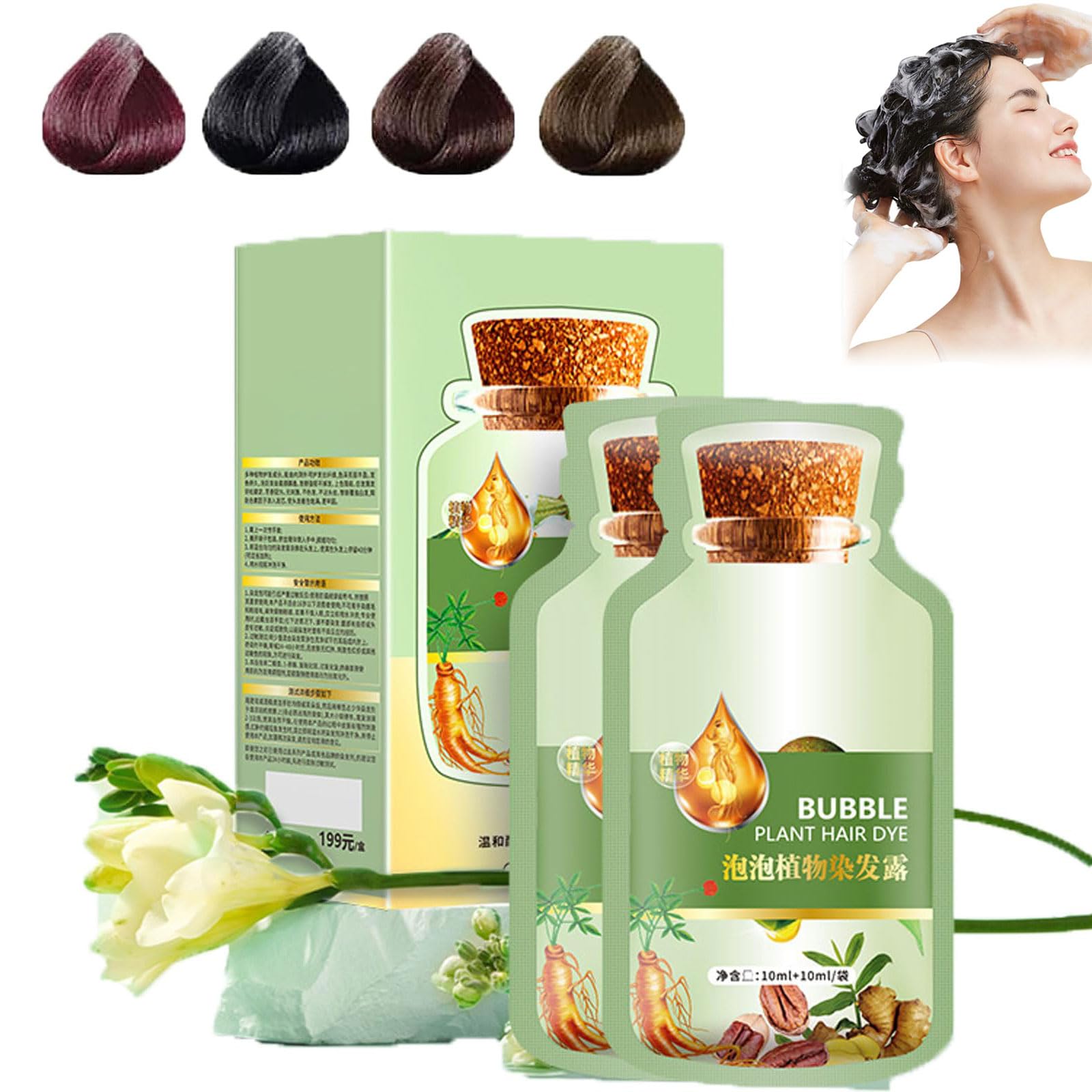 Specification Product name: Natural Plant Hair Dye Net: 20mlx10pcs Shelf life: 3 years Color: coffee, natural black, chestnut brown, black teal Product efficacy: Contains plant extract, mild dyeing hair care, easy and healthy cover grey hair. How to use: Step 1: Wear gloves, and wash your hair(no need to get it) Step 2: Open the package, squeeze out the hair dye into your palm, lather well, and then evenly apply it to your hair, and rub for 10 minutes. Step 3: If there is a lot of grey hair or hard black hair, if there is still grey hair or poor coloring before rinsing, repeat the process once or more. Step 4: After you can't see gray hair or you are satisfied with the color effect, rinse it off with clean water, you can use shampoo and conditioner, and dry it to get the ideal hair color. Package includes: 1pcs Plant Extract for Grey Hair Color Bubble Dye Notes: 1. Due to manual measurement, there is a certain error in the product size. 2. Due to lighting effects and shooting angles, there may be chromatic aberration in the product, please understand.?Warm Tip? Our products are made with natural ingredients. Please test on your arm before use and wait for a allergic reaction. Just Contact Us To Get A Solution If You Are Not Satisfied With The Hair Dye Shampoo. ?Save Time Money? With this hair dye shampoo, you can dye hair at home. Forget long and costly visits to hair salons. You can now dye your hair quickly and easily at home by yourself and save a ton of money. ?Easy To Use?Requiring no bowl or brush, just put on plastic gloves, apply the instant hair dye shampoo on your hair, massage for 5- 10 minutes , After 20 Minutes Rinse Well With Clean Water. Finally You Will Have Shiny Color Hair You Like. ?Gray Hair? No More!?Banish gray hair worries with ease! Our hair dye shampoo covers all hair types, ensuring effective coverage for thick, fine, straight, or curly hair textures. ? Natural Bubble Dye?Natural plant formula, no contamination of scalp, natural effect, no hair injury. It is also nourishes, protects and repairs scalp.