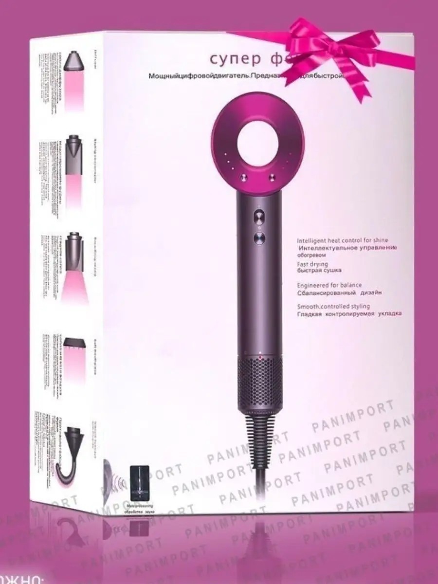 NEW FOR 2022! Premium SUPERSONIC SUPER HAIR DRYER HD15 with a 3-meter cord. This Dyson hair dryer has become a dream gift. This Dyson hair dryer has become a dream gift for many girls. This hair dryer styles hair so effectively and quickly that it has become a sought-after gift since its introduction and remains so today. A set with 5 magnetic attachments in a gift box. This hair dryer has always been and will always be the most coveted gift for every girl, no matter the occasion! This innovative hair dryer boasts a stunning design and quiet operation. Its 1600W power creates a powerful airflow. Three speeds and four temperature settings provide the perfect setting. This lightweight and silent hair dryer features a unique body design, and the motor is housed in the handle, providing maximum ease of use. Even professional stylists and hairdressers don't get tired when using a hairdryer all day long. The nozzle delivers a directed air flow, which is perfect for drying and straightening unruly hair, while the concentrator is for stylish styling. And with the diffuser, you can easily add volume or create curls in minutes. Professional, powerful hairdryer HD07 FUNCTIONS. The new latest 7th series hairdryer: - Speed and temperature control - 3 airflow speed settings - Super lightweight hairdryer! Hairdressers and stylists don't get tired when using it all day long, it's all about balance, the motor is located in the handle - 4 temperature settings. Heating from 28 to 100 C: cool air (28 °C), gentle drying (60 °C), standard drying (80 °C) and super-fast drying (100 °C) - 5 magnetic attachments for different styling styles - IONIZATION for removing static electricity from hair. Negative ions eliminate static electricity. Curls are shiny and manageable. FEATURES - Easy to operate - Power: 1600 W - Durable cord - The hair dryer is very quiet, the sound is pleasant - Presentable gift packaging - Instructions in Russian and English - Video review. Free shipping within Russia. We check for quality! Free returns. Available colors: purple, pink. Hair dryer - 1 pc., magnetic attachments 5 pcs., gift packaging - 1 pc. The powerful professional Supersonic Super Hair Dryer set and 5 magnetic attachments are similar in style to the Dyson hair dryer and use similar technology, designed for drying and styling hair. This HD07 styler model for styling has special technology to protect hair from hot air, which will prevent damage to the hair and scalp. The hair dryer is perfect for daily use. Changing attachments is very easy thanks to the magnetic bases, which do not heat up at all during operation. There are 4 temperature settings: for quick drying and styling; for standard drying; for drying at a lower temperature and separation; for drying with cold air. It features an ionization function, a curling diffuser, and a straightening attachment. The most desired gift set for a friend, girlfriend, mother, or woman: a fuchsia, black, gray, and airwrap brush. 1 2 3 lightweight HD01 HD03 HD07 travel household Remington.