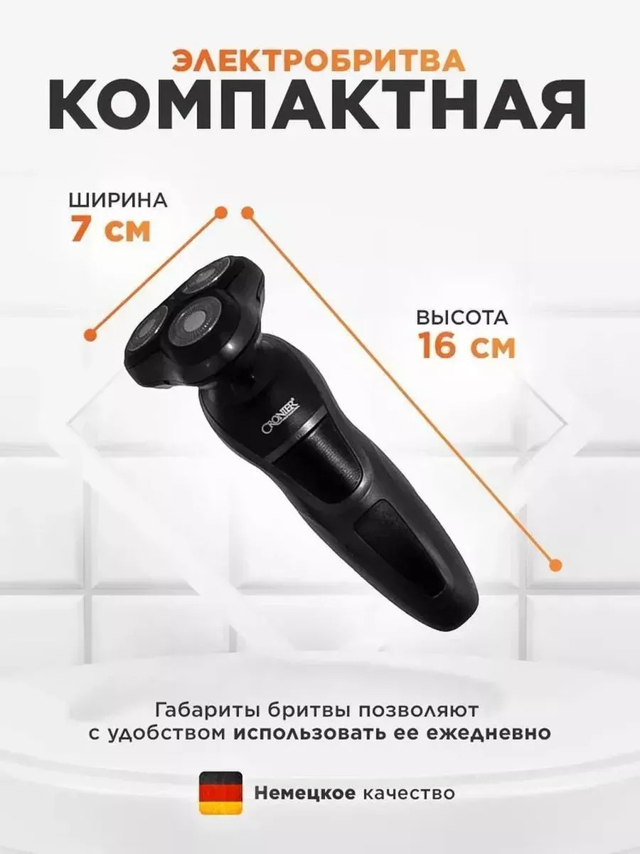 Влагозащищенная аккумуляторная электробритва с 3-мя головками, которые обеспечивают эффективное влажное и сухое бритье, сбривая еще больше волосков за одно движение. Гибкие 3D поворотные головки электрической бритвы движутся в разных направлениях и в точности повторяют изгибы лица, что обеспечивает тесный контакт с кожей и эффективное бритье даже в самых труднодоступных местах. Бритва мужская электрическая полностью удаляет щетину и отдельные волоски. Спешите? Поставьте электрическую бритву на зарядку на 5 минут, чтобы заряда хватило побриться 1 раз. Немецкое качество и нержавеющая сталь создают надежный и прочный инструмент для самых требовательных мужчин. CRONIER – это союз надежности, качества и продуманного дизайна. Профессиональная электробритва с возможностью работы от встроенного легкого и мощного литиевого аккумулятора в беспроводном режиме, позволит использовать бритву в поездках, на отдыхе, на море, в автомобиле и командировке. Электробритва мужская позволяет выбирать сухое или влажное бритьё в зависимости от Ваших предпочтений и потребностей. Также эта электробритва оснащена 3 плавающими головками, которые адаптируются к контуру Вашего лица, что обеспечивает максимальную тщательность и комфортность при бритье. Модуль с бреющими головками можно открыть и промыть под струей воды Это бритва ничем не уступает по качеству таким известным брендам, как Philips, Sony, Braun, Panasonic, но стоит дешевле! Вы не переплачиваете за широко разрекламированный бренд, а платите именно за высокое качество и надежность бритвы! Если Вы ищете идеальный подарок для своего друга, папы или мужа на день рождения или 23 февраля, то электро бритва мужская отличный выбор. Не ждите и не мучайте себя неудобной классической бритвой. Закажите сейчас электробритву мужскую CRONIER, и получите максимально комфортный и быстрый результат от надежного и качественного устройства