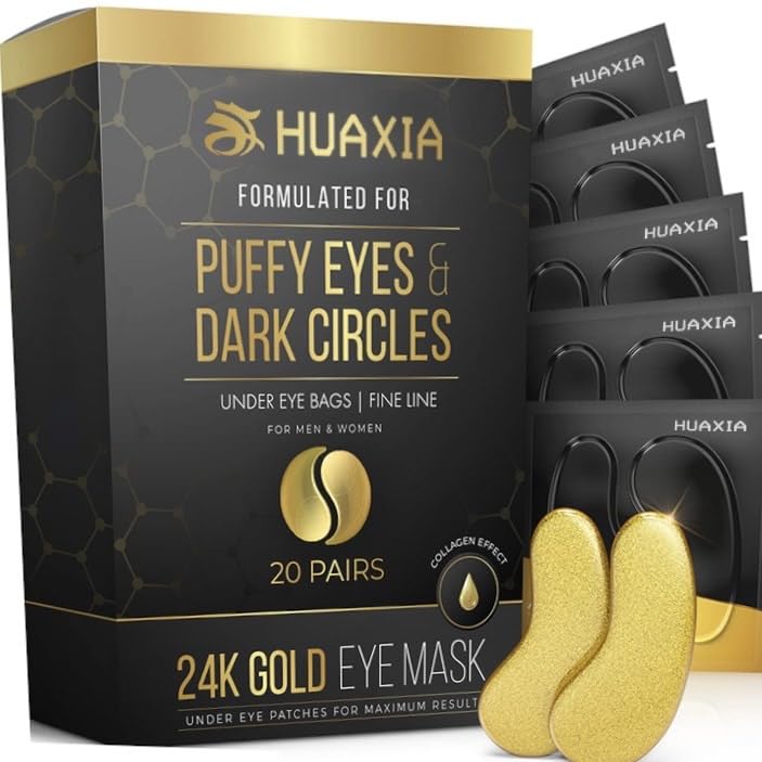 HUAXIA 24K GOLD EYE MASK Formulated for Puffy Eyes & Dark Circles for Men and Women 20 Pairs Under Eye Patches for Maximum Result Banish Dark Circles, Puffiness, and Wrinkles