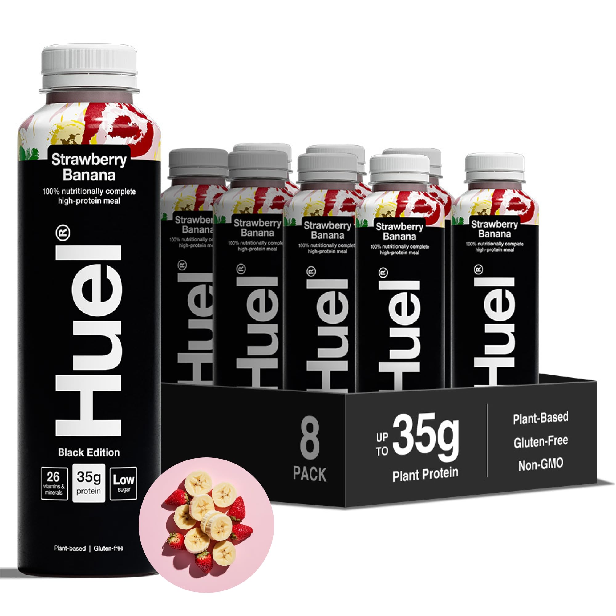Huel Black Edition 8 x 500 ml bottles protein shakes strawberrybanana flavour highprotein drink 35 g protein per bottle rich in vitamin D fatty acids calcium readytoeat meals