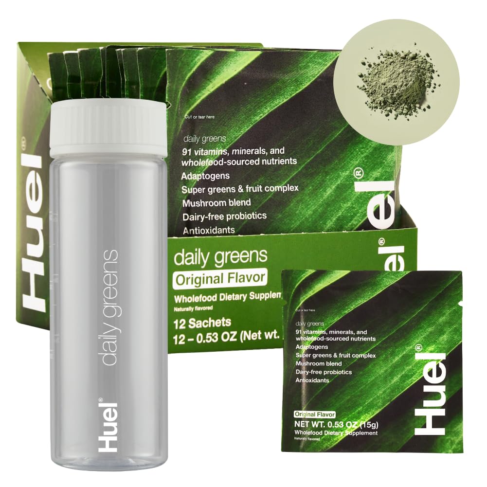Huel Daily Greens Bundle | Single Serve Original + Bottle | Superfood Greens Powder | 91 Vitamins Minerals and Wholefood-Sourced Ingredients | 12 Servings | Lockable Lid to Avoid Spills | BPA Free