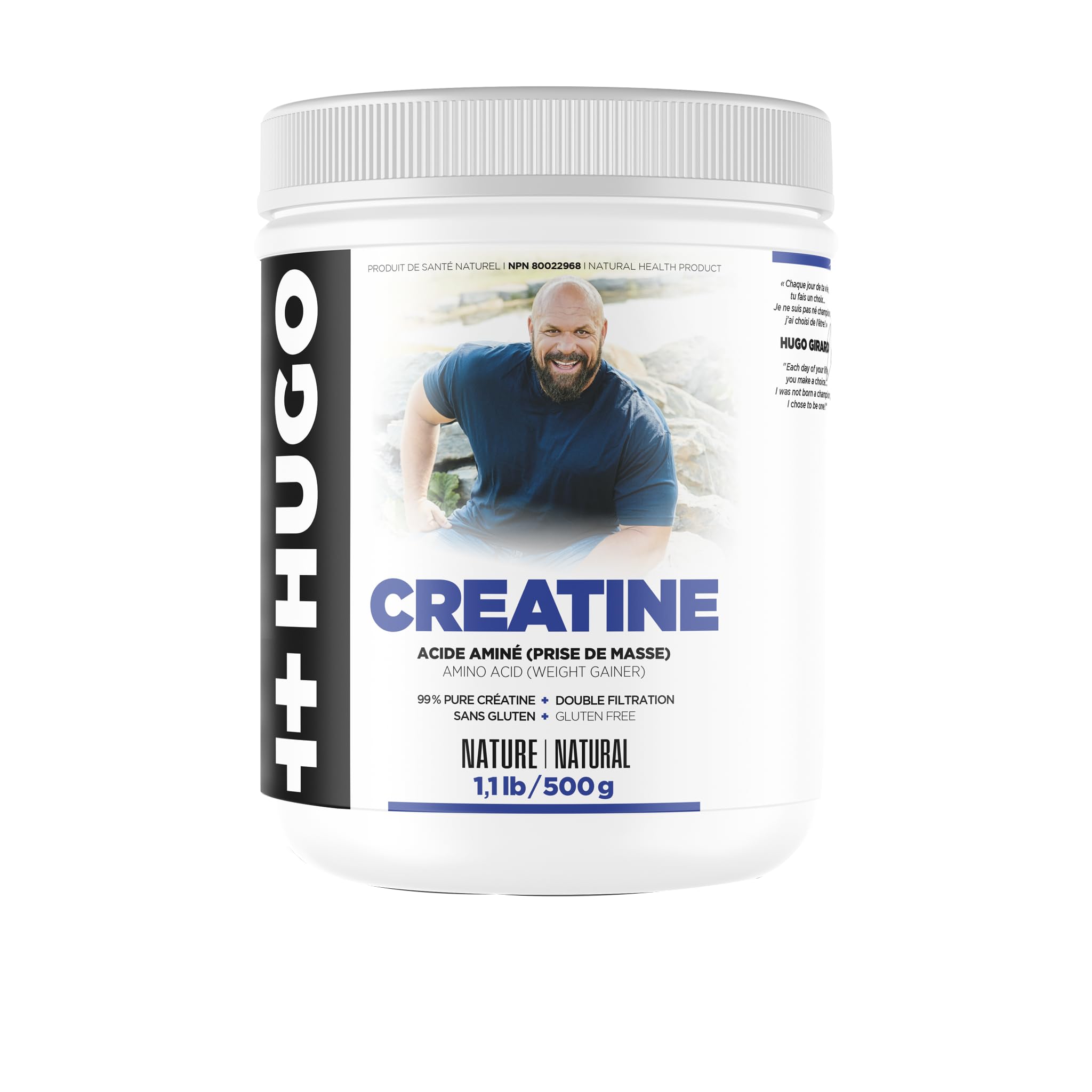 Product descriprion : Increases muscle mass when used in conjunction with a resistance-training regimen. Improves performance during repeated and brief intense physical activity by increg the muscle volume rate of energy. Methods of use : Adults : 3 to 4 servings (15-20g) per day. Mix with 125ml of water, juice or your favorite drink. Take separately from products containing caffeine. Consult a health care practitioner prior to use if you are pregnant or breastfeeding, or if you have any liver or kidney diseases. Brand Story about Hugo Girard: A native of Portneuf-sur-Mer on Quebec's North Shore, he started training at the age of 5 and by 12 he was already determined to become the strongest man in the world. In 2002, he achieved this feat by winning the title of IFSA SuperSeries World Champion. He was the Canadian champion of his sport from 1995 to 2004 as well as the North American champion from 2001 to 2002.