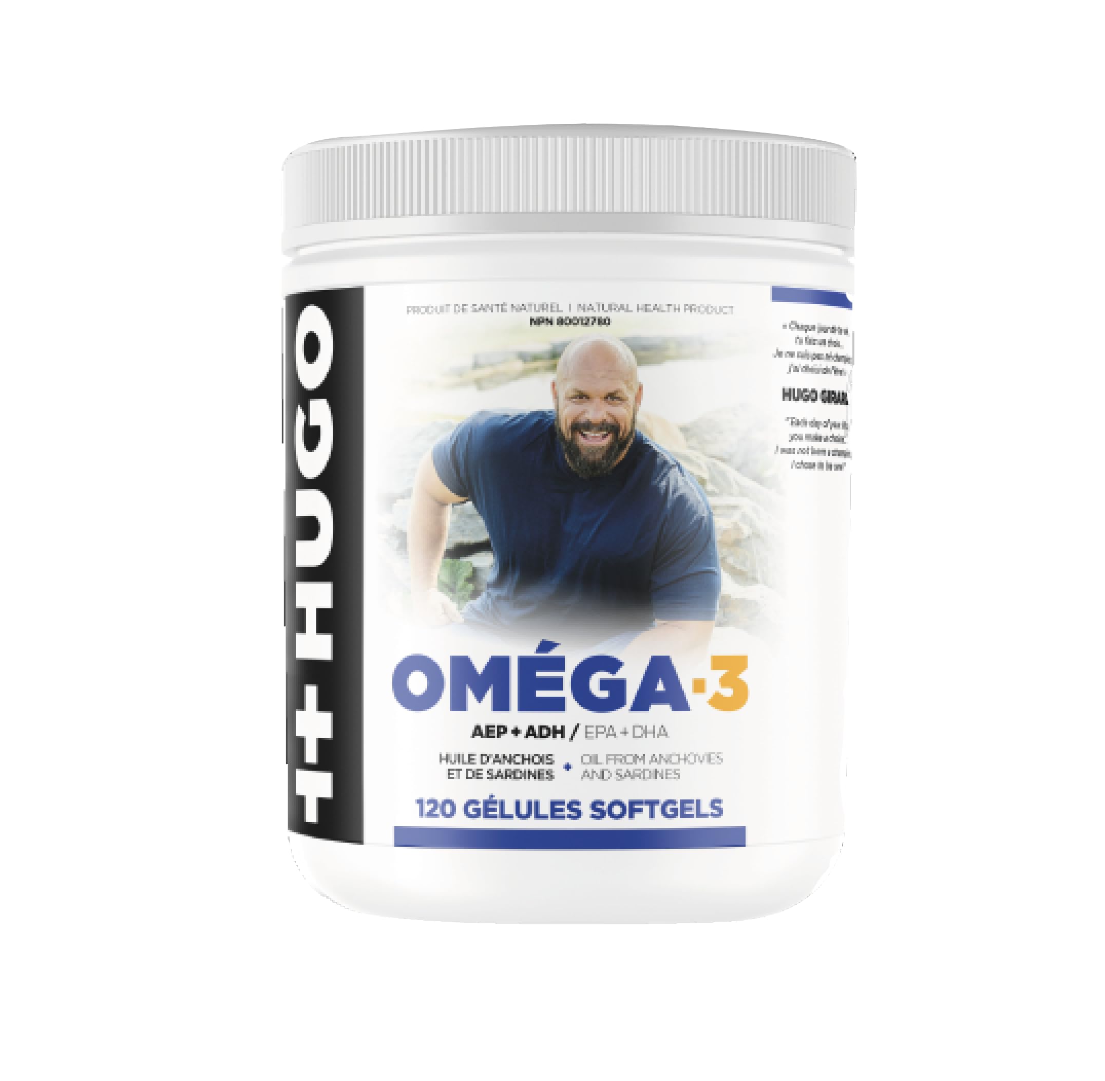 : 120 EPA Capsules DHA anchovy and sardine oil Recommended Use or Purpose: Source of omega-3 fats for the maintenance of good health. Contributes to cognitive health and or brain function. Helps to maintain support cardiovascular health. Helps to reduce triglycerides triacylglycerols blood levels. Recommended Dose: Adults. 3 capsules a day with meals. Keep it in a cool and dry place. Do not use if seal under the bottle cap is missing or broken. Keep out of children's reach. Brand Story about Hugo Girard: A native of Portneuf-sur-Mer on Quebec's North Shore, he started training at the age of 5 and by 12 he was already determined to become the strongest man in the world. In 2002, he achieved this feat by winning the title of IFSA SuperSeries World Champion. He was the Canadian champion of his sport from 1995 to 2004 as well as the North American champion from 2001 to 2002.