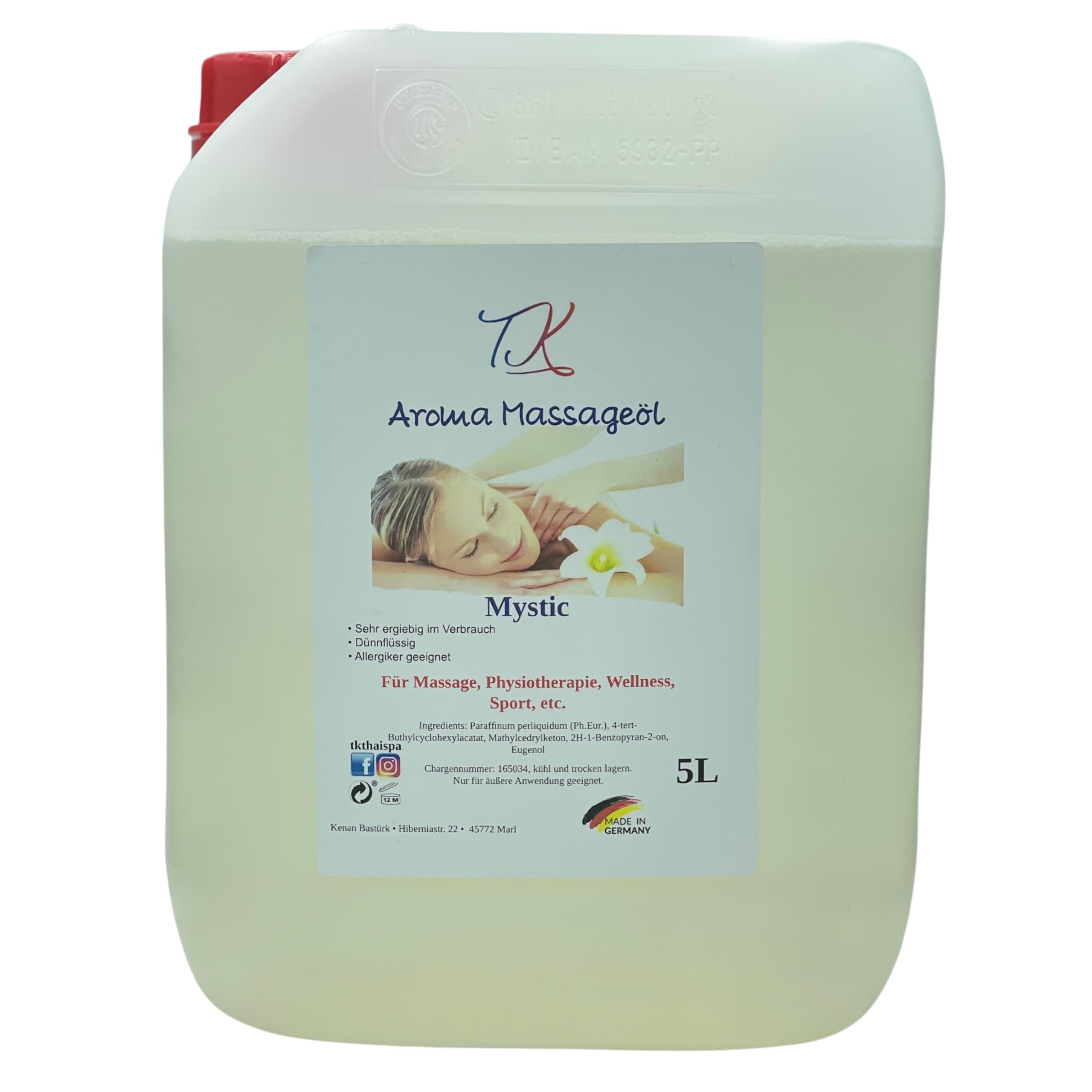 : TK Thaispa Massage Oil and Aroma (available in a variety of scents) is a product for professional Thai massage applications. After years of use, this is our perfect massage oil, both for clients and for you as a user. Try it once and see the difference. It is 100 free of dyes and preservatives. Allergen-free, making it ideal for allergy sufferers and those with sensitive skin. Due to its low viscosity, it is a thin liquid that doesn't stick to the skin. Even a small amount creates a perfect glide. Stains on textiles are easy to wash out. Ingredients: Paraffinum perliquidum (Ph.Eur). Mystic Aroma. Storage: store in a cool, dry place, away from light, in tightly closed containers. Do not ingest. Avoid contact with eyes and mucous membranes. Keep out of reach of children. Can be stored for at least 12 months (1 year) if stored correctly. Directions for use: Apply to the skin in sufficient quantity to create a smooth glide. Use for massage, physiotherapy, or general well-being. Do not ingest, do not get into eyes or mucous membranes. Keep out of reach of children. Safety Warning: Do not ingest, do not get into eyes or mucous membranes. Keep out of reach of children. Storage: store in a cool, dry place, away from light, in tightly closed containers. See moreFor external use only. Very economical. Thin liquid. Mineral massage oil (paraffin).Description du produit L'huile de massage et l'arôme TK Thaispa au choix est un produit pour les applications professionnelles de massage thaïlandais. Après des années d'utilisation, il s'agit de notre huile de massage parfaite, à la fois pour les clients et pour vous en tant qu'utilisateur. Testez-le une fois et voyez la différence. Il est 100 exempt de colorants et de conservateurs. Sans allergènes, donc idéal pour les personnes souffrant d'allergies et pour les peaux sensibles. En raison de sa faible viscosité, il est fin liquide et ne colle pas à la peau. Même avec une petite quantité, on crée une glisse parfaite Les taches sur les textiles sont faciles à laver. Ingrédients : paraffinum perliquidum (Ph.Eur). Arôme Mystic. Stockage : dans un endroit frais et sec, à l'abri de la lumière, dans des récipients hermétiquement fermés. Ne pas ingérer, ne pas mettre dans les yeux et les muqueuses. Tenir hors de portée des enfants. Se conserve pendant au moins 12 mois (1 an) s'il est correctement stocké. Mode d'emploi Appliquer sur la peau en quantité suffisante pour créer une glisse parfaite. Utiliser pour un massage, une physiothérapie, ou pour le bien-être. Ne pas ingérer, ne pas mettre dans les yeux et les muqueuses. Tenir hors de portée des enfants. P.when('A').execute(function(A) { A.on('a:expander:toggle_description:toggle:collapse', function(data) { window.scroll(0, data.expander. expander[0].offsetTop-100) }) }) Avertissement De Sûreté Ne pas ingérer, ne pas mettre dans les yeux et les muqueuses. Tenir hors de portée des enfants. Stockage : dans un endroit frais et sec, à l'abri de la lumière, dans des récipients hermétiquement fermés. Voir plusPour un usage externe uniquement. Très économique. Liquide fin. Huile de massage minérale (paraffine).Huile de massage aromatique - Mystic - 5 l - Pour massage, physiothérapie, bien-être, etc. - Qualité médicamenteuse (5 l, mystic)