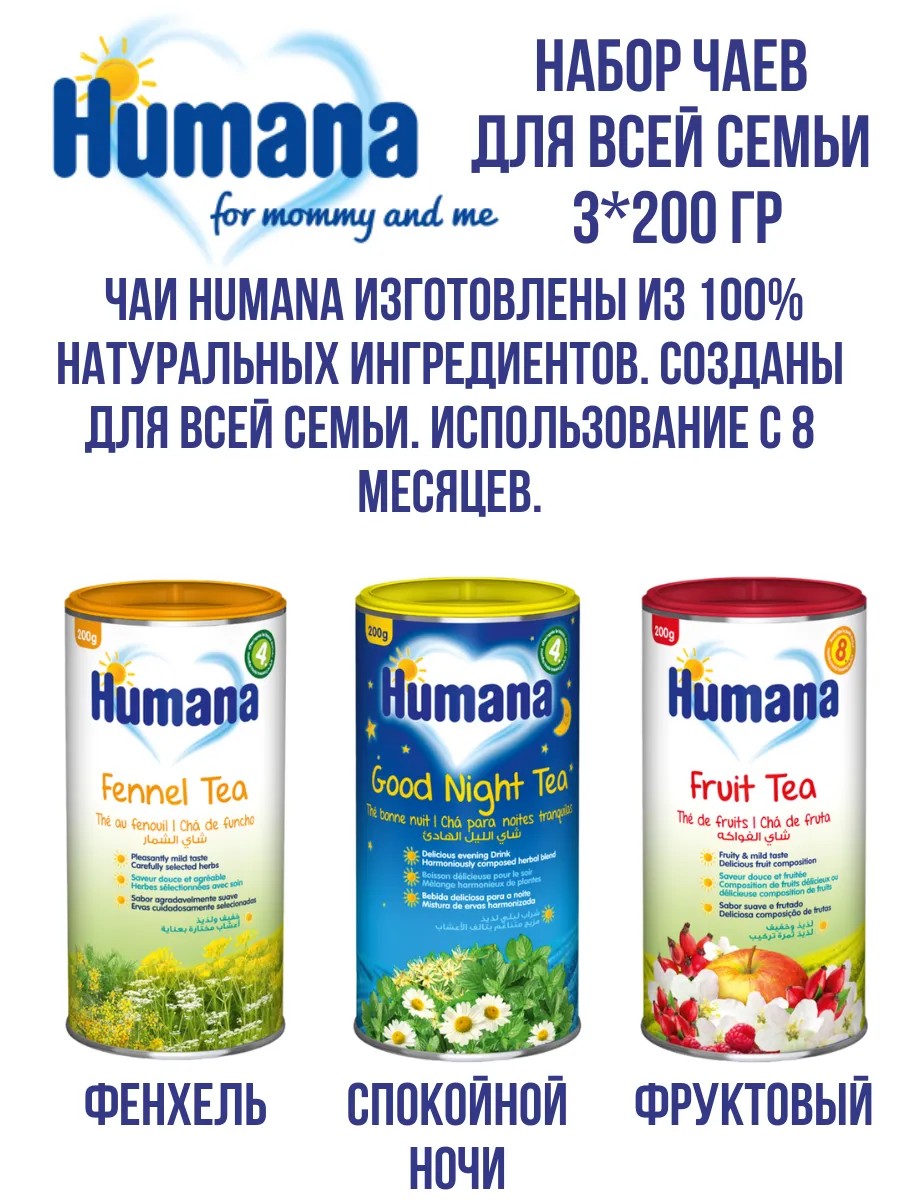 Травяные чаи Humana изготовлены из 100% натуральных ингредиентов. Созданы для всей семьи. Использование с 8 месяцев.