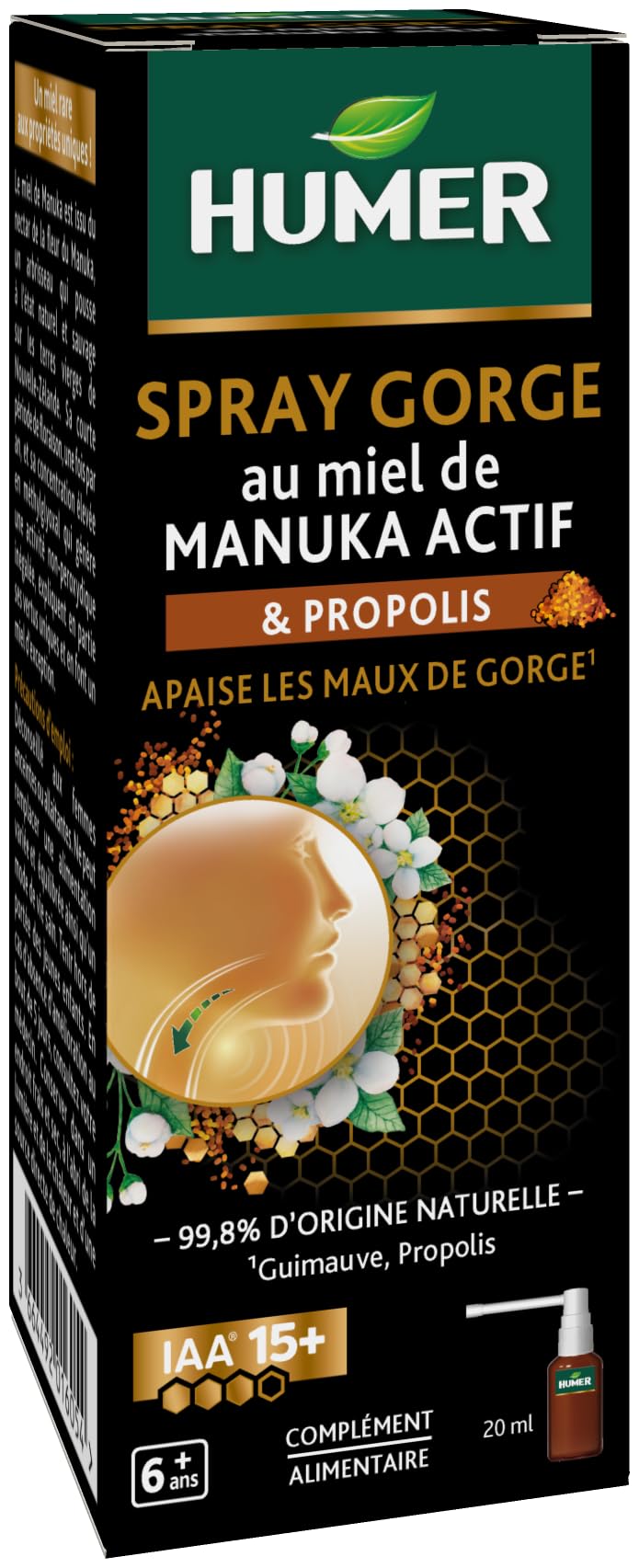 Humer - Spray gorge Manuka 15 - Apaise la gorge - A base de Miel de Manuka 15 , de Propolis et de Guimauve - 4 pulvérisations 4 fois par jour - 20 ml
