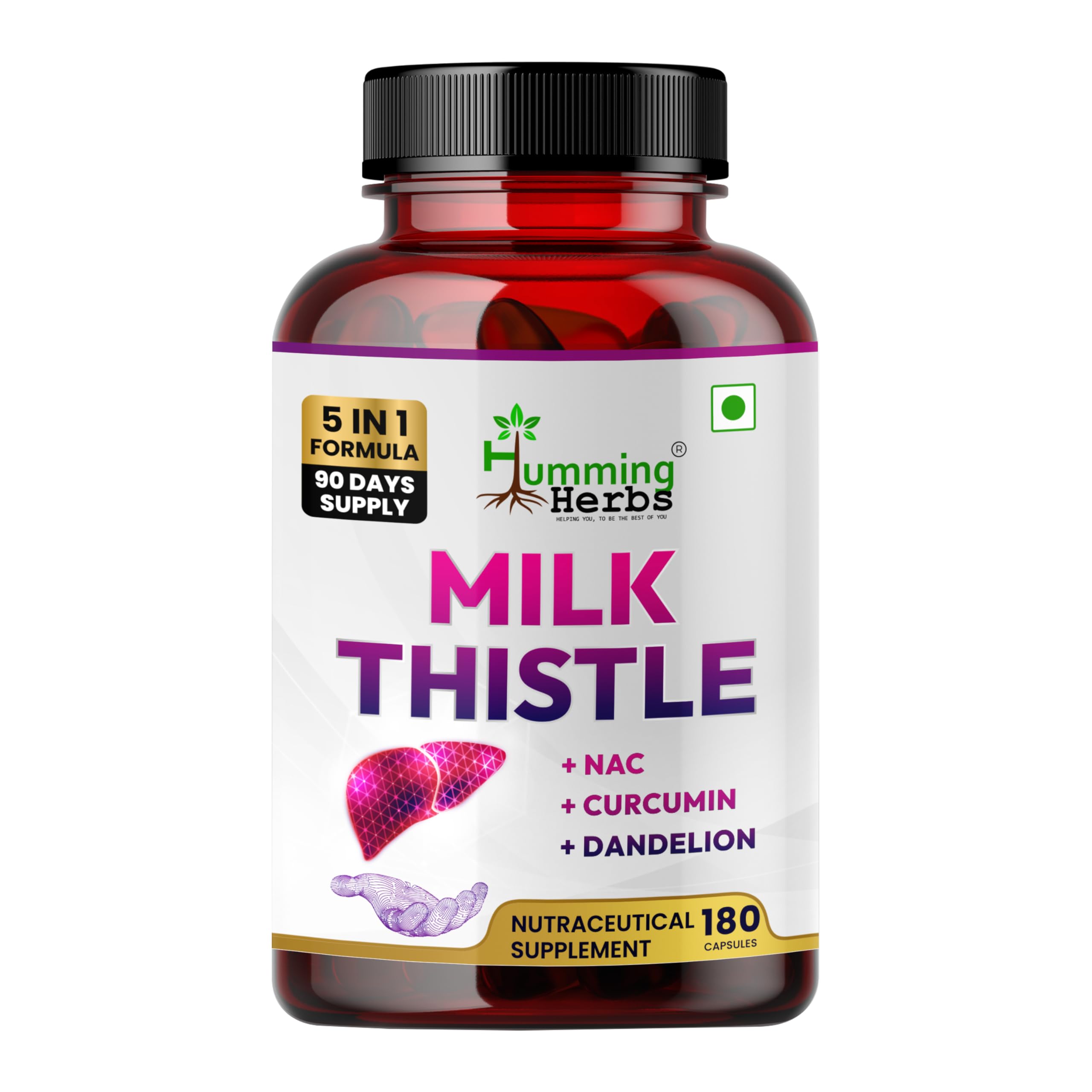 Humming Herbs Milk Thistle Supplement 1000Mg 5-in-1 Formula with NAC Curcumin Dandelion & Black Pepper 180 Capsules