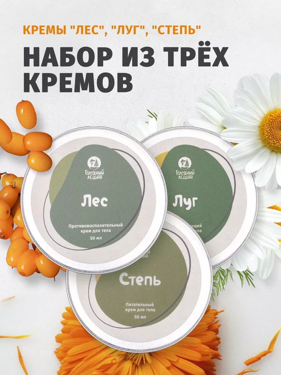 Набор многофункциональных кремов Голодный Леший - Лес+Луг+Степь. Лес - упор на снятие воспалений, Луг - упор на увлажнение, Степь - упор на питание. Имеют рабочий и «чистый» состав. Подходят для младенцев, детей и взрослых (и даже для животных!). Хорошо снимают воспаления, раздражение кожи, смягчают. Способствуют регенерации, ускоряют заживление царапин, ссадин, трещин, повреждений кожи. Идеально подходят для питания очень сухой кожи рук, для сухих участков тела (колени, локти, ноги, пятки), для лица (если нужно успокоить раздраженную кожу, заживить повреждения). Эффективно борются с шелушениями на лице и теле. Помогают от трещин на пятках. Можно использовать как успокаивающий крем. Отлично подойдут для атопичной кожи, включая атопичную кожу у детей (не является лекарственным средством). Эти универсальные кремы также будут полезны для обветренной кожи и защиты кожи от холода зимой. Эффективно снимают зуд от укусов насекомых. Подходят для профилактики растяжек при беременности (и не только), от трещин на сосках при грудном вскармливании. Отлично подходят для заживления татуировок. Эффективны при использовании после бритья (для женщин и мужчин), после депиляции (после депиляции от раздражения зоны бикини), после эпиляции – снимает раздражение, предотвращает воспаление, ускоряет заживление. Можно использовать для ухода за кожей в интимной зоне. Также могут быть использованы для снятия раздражения от подгузников у малышей. После солнечных ожогов или загара помогут восстановить кожу. Благодаря своей многофункциональности и удобному формату, они идеально подходят для путешествий, походов, а также для повседневного использования. Разработано по стратегии устойчивого ухода. Не содержит продуктов животного происхождения, безопасно для природы. Подходит веганам, не тестируется на животных. Сделан с заботой об экологии.