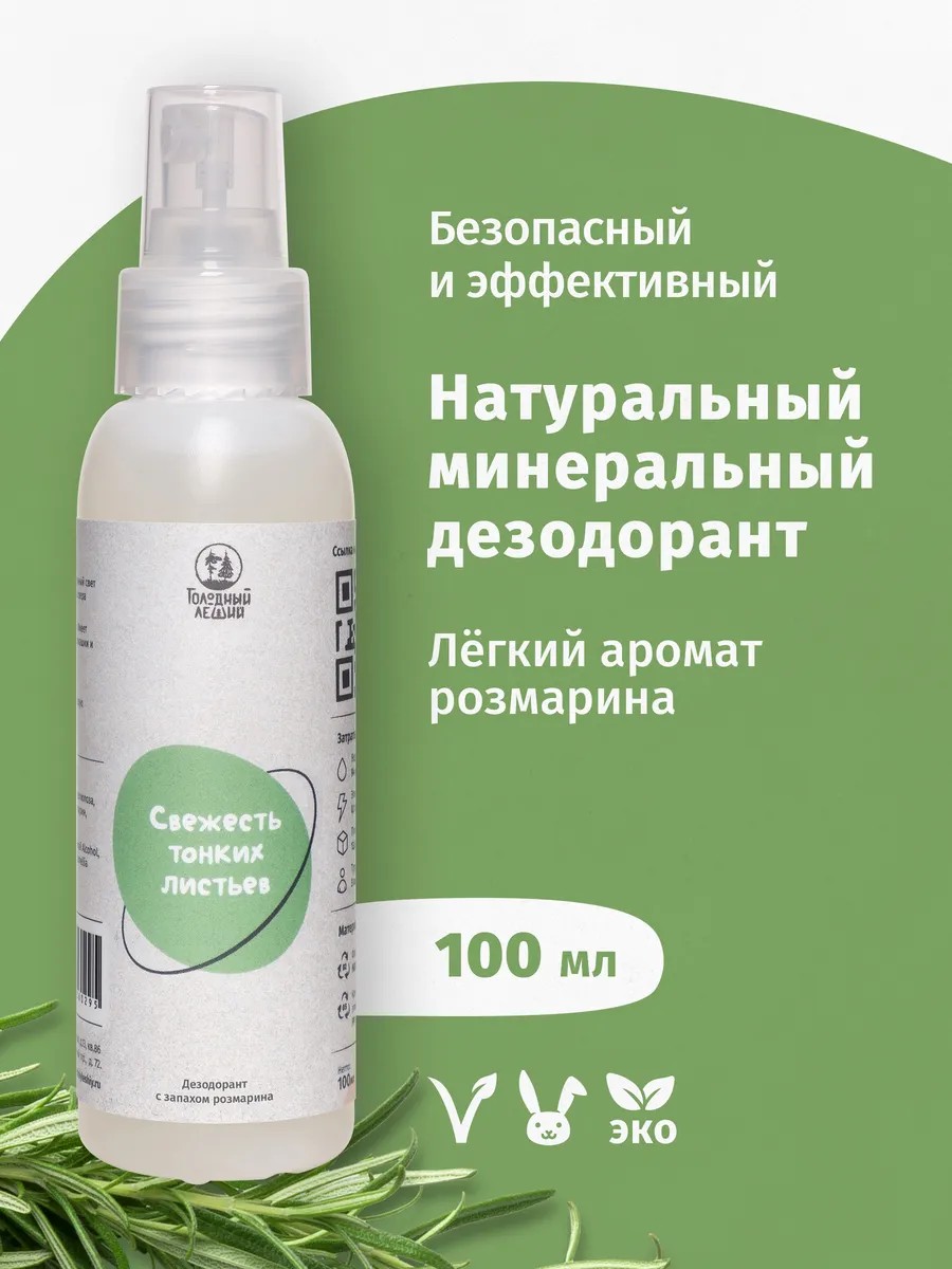 Минеральный дезодорант-спрей (100мл) из квасцов, который отлично защищает от запаха пота, но при этом не закупоривает поры. Дезодорант не блокирует естественный процесс терморегуляции, а предотвращает размножение бактерий, которые вызывают запах пота. То есть при использовании дезодоранта пот выделяется, но не пахнет. Влаги будет меньше, так как квасцы обладают абсорбирбирующим действием. Действует мягко, но эффективно. Подходит для женщин, мужчин, подростков. Очень лёгкий аромат розмарина (почти без запаха), который быстро улетучивается после нанесения. Дезодорант не имеет яркого запаха, так как его функция не перекрыть запах пота, а предотвратить его появление. Не оставляет белых и желтых следов на одежде. Можно использовать на любые части тела, в том числе как дезодорант для ног. Без спирта, не сушит кожу. Не содержит продуктов животного происхождения, безопасно для природы. Подходит веганам, не тестируется на животных. Сделано с заботой об экологии. Состав: вода, алюмокалиевые квасцы, гидролат розмарина.