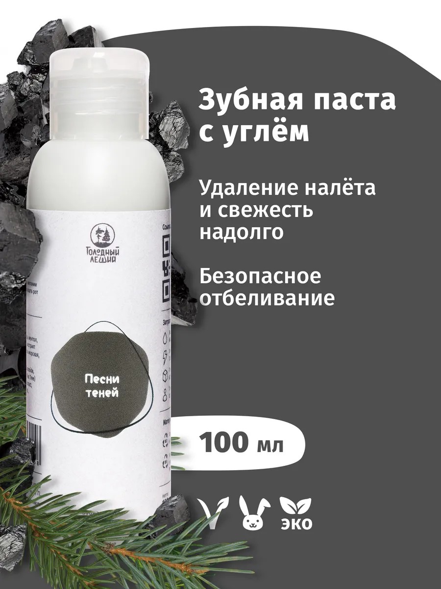 Отбеливающая зубная паста с активированным углём и хвойным ароматом "Песни теней" 100мл. Хорошо пенится и очищает налет надолго. Мягко отбеливает за счет угля в составе. Мы не добавляем уголь в виде мелких частиц, поэтому паста не вредит эмали. Не сушит и не жжёт слизистые, очищает бережно. Содержание ментола высокое. RDA 90. Содержит растительные экстракты и эфирные масла для здоровья и укрепления дёсен. С кальцием, без фтора. Бутылочку можно дополнить дозатором. Натуральный, безопасный и экологичный состав. Без sls. Подходит веганам, не тестируется на животных. Сделано с заботой об экологии.