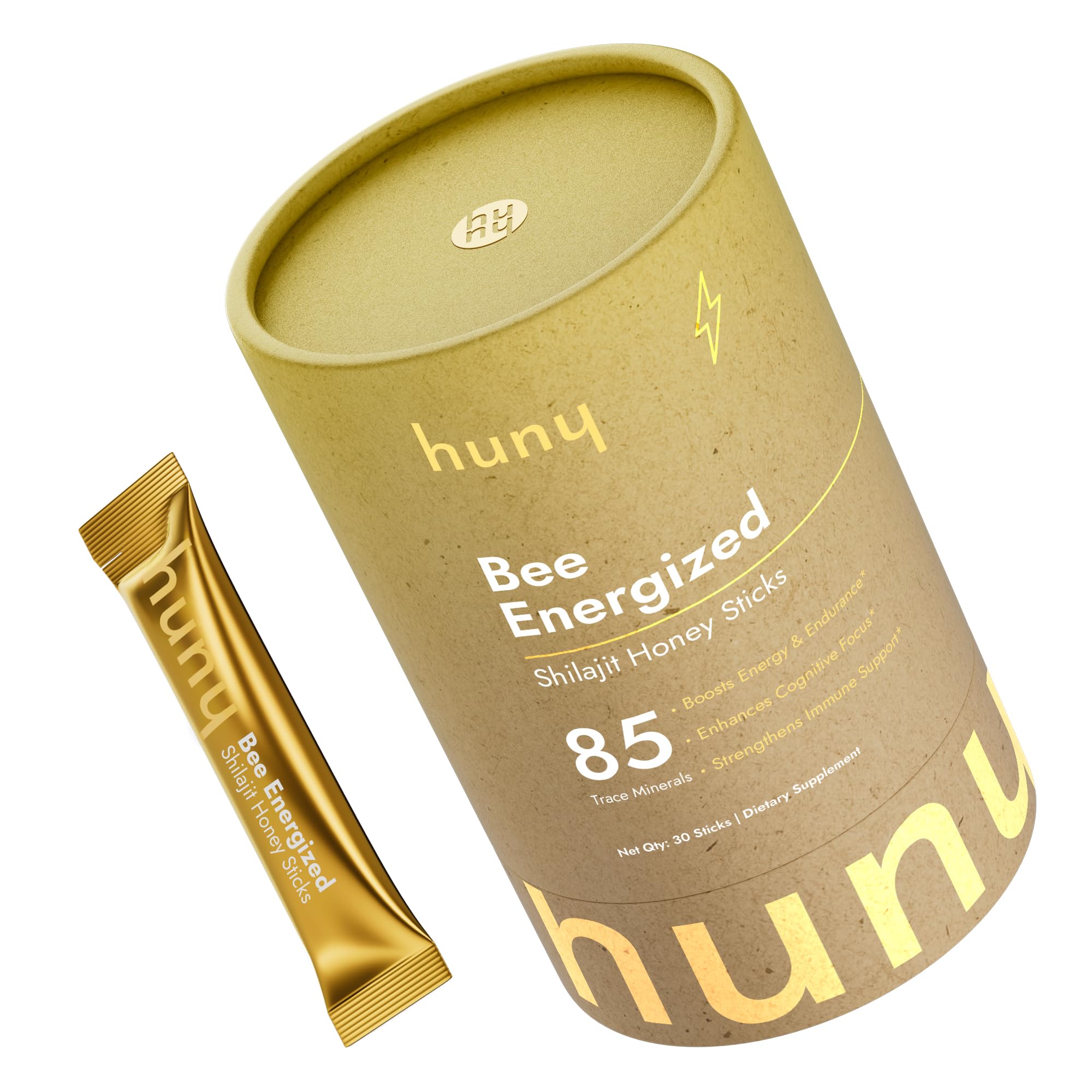HUNY Bee Energized with Shilajit Honey Sticks | 85+ Trace Minerals for Clean Energy, Focus & Immune Support | Pure Himalayan Shilajit for Men & Women | 30 Count (Pack of 1)