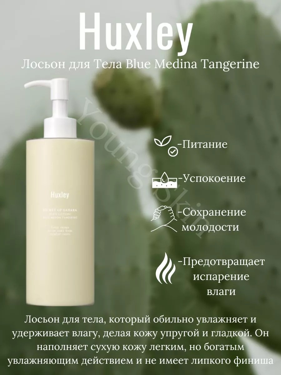 Huxley Лосьон для тела Secret of Sahara Body Lotion Blue Medina Tangerine, 300 мл. Лосьон для тела с комплексом масел разработан по классической формуле, в ее основе натуральный экстракт кактуса опунции, который растёт в пустыне. Опунция богата фолиевой и линолевой кислотой, а также витаминным комплексом, благодаря этому кожа становится более крепкой, повышается ее эластичность и упругость. Аминокислоты укрепляют клеточные мембраны, повышают гидролипидный баланс эпидермиса, улучшают микроциркуляцию крови и питание тканей Оливковое масло обеспечивает надежную защиту эпидермиса от негативного воздействия факторов окружающей среды, укрепляет кожу, глубоко увлажняет, устраняет сухость и шелушения, нормализует природный рН баланс. Способ применения: Немного лосьона нанесите на сухую очищенную кожу массажными движениями.