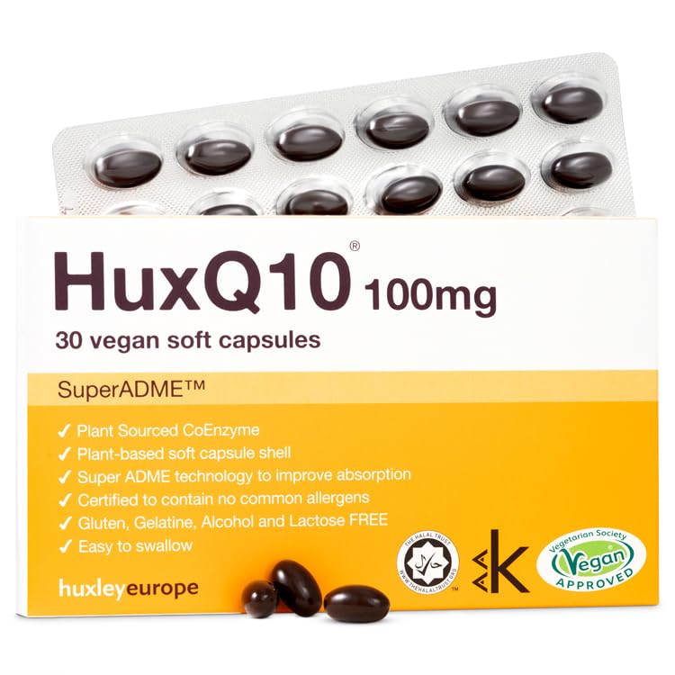 HuxQ10 has been specially formulated to include only plant-based ingredients. The primary source of HuxQ10 is yeast fermentation. This process results in CoQ10, which is identical to the natural molecule. The Q10 is formulated by dissolving the Q10 molecule in natural vegetable oil. Ingredients: Natural sunflower oil, plant-based coenzyme Q10, thickeners: mono- and diglycerides of fatty acids (E471), emulsifier: natural sunflower lecithin (E322), vegan capsule shell modified corn starch: hydroxypropyl corn starch (E322). 1440), Vegetable glycerin (E422), carrageenan (E407), acidity regulator: disodium phosphate, natural colors: black iron oxide and red iron oxide (E172) Contains sweeteners Sweeteners and additives Sweeteners Vegetable glycerin (E422) Additives Mono- and diglycerides of fatty acids (E471), natural sunflower lecithin (E322), vegetable glycerin (E422), carrageenan (E407), disodium phosphate, black iron oxide, red iron oxide (E172) Dietary information This product is suitable for the following requirements Vegetarian Vegan product Allergens. This product is hypoallergenic does not contain any of the 14 major allergens listed in Annex II (1169 2011) of the European Regulation on food information for consumers. Storage instructions: One to four capsules daily or as directed by a healthcare professional. For better absorption, take with food when possible. Warnings: If you are pregnant, breastfeeding, have a medical condition, or are under medical supervision, please consult a doctor before use. Food supplements should not be used as a substitute for a varied and balanced diet and a healthy lifestyle. Do not exceed the recommended daily dose. Do not purchase or consume if the seal is broken. Keep out of reach of children. False INGREDIENTS Natural sunflower oil, vegetable-source coenzyme Q10, thickeners: mono- and diglycerides of fatty acids, emulsifier: natural sunflower lecithin. Vegan capsule shell modified corn starch: hydroxypropyl corn starch, vegetable glycerin, carrageenan, acidity regulator, disodium phosphate, natural colors, black iron oxide and red iron oxideFor best results: Consume with food as part of a balanced diet to support your brain and heart health. Consult a healthcare professional before use if you are taking medication, pregnant, or breastfeeding. Now approved kosher by Rabbi Adler. Huxley Quality: Count on us for a properly formulated COQ10 supplement, designed for absorption and accessibility. Your plant-based Q10 supplements are manufactured according to GMP with high quality standards. Vegetarian Society has approved it as vegan-friendly. Easy to Swallow: Enjoy easy-to-swallow Q10 supplements sized for flexible consumption. Your 100mg capsules make it easy to follow your doctor's dosage instructions. Accessible Supplement: Enhance your body's organ and muscle recovery processes with capsules that meet your needs. This fermented Q10 supplement is vegan, gluten-free, and easy to swallow. Antioxidant support: Support and maintain your cardiovascular, skin, and muscle health with coenzyme Q10. Your ubiquinone dietary supplement adds to your body's natural supply of this antioxidant.Huxley Europe Q10 Coenzyme 100 mg Lot de 30 gélules pour le cœur, la pression artérielle, la santé de la peau avec l'ubiquinone végétalienne COQ10 Fermentée SuperADME facile à avalerDESCRIPTION DU PRODUIT DESCRIPTION DU PRODUIT HuxQ10 a été spécialement formulé pour inclure uniquement des ingrédients d'origine végétale. La principale source de HuxQ10 est la fermentation de levure. Ce processus entraîne la CoQ10 qui est identique à la molécule naturelle. Le Q10 est formulé en dissolvant la molécule Q10 dans de l'huile végétale naturelle. Ingrédients : huile de tournesol naturelle, coenzyme Q10 d'origine végétale, épaississants : mono et diglycérides d'acides gras (E471), émulsifiant : lécithine de tournesol naturelle (E322), coquille végétalienne de capsule amidon de maïs modifié : amidon de maïs hydroxypropylique (E322). 1440), Glycérine végétale (E422), carraghénane (E407), régulateur d'acidité : phosphate disodique, couleurs naturelles : oxyde de fer noir et oxyde de fer rouge (E172) Contient des édulcorants Édulcorants et additifsÉdulcorants Glycérine végétale (E422) Additifs Mono et diglycérides d'acides gras (E471), lécithine naturelle de tournesol (E322), glycérine végétale (E422), carraghénane (E407), phosphate disodique, oxyde de fer noir, oxyde de fer rouge (E172) Informations sur la diététiqueCe produit est adapté aux exigences suivantesVégétarien Produit végétalien Allergènes. Ce produit est hypoallergénique ne contient aucun des 14 principaux allergènes énumérés à l'annexe II (1169 2011) du règlement européen sur les informations alimentaires pour les consommateurs. Instructions de stockage : une à quatre capsules par jour ou selon les instructions d'un professionnel de la santé. Pour une meilleure absorption, prendre avec de la nourriture lorsque cela est possible. Avertissements : si vous êtes enceinte, allaitez, avez un problème médical ou si vous êtes sous surveillance médicale, veuillez consulter un médecin avant utilisation. Les compléments alimentaires ne doivent pas être utilisés comme substitut à une alimentation variée et équilibrée et à un mode de vie sain. Ne pas dépasser la dose journalière recommandée. Ne pas acheter ou consommer si le joint est cassé Tenir hors de portée des enfants. faux INGRÉDIENTS Huile de tournesol naturelle, coenzyme Q10 d'origine végétale, épaississants : mono et diglycérides d'acides gras, émulsifiant : lécithine de tournesol naturelle. Enveloppe végétalienne de la capsule amidon de maïs modifié : amidon de maïs hydroxypropylique, glycérine végétale, carraghénane, régulateur d'acidité, phosphate disodique, couleurs naturelles, oxyde de fer noir et oxyde de fer rougePour des résultats idéaux : consommez avec de la nourr